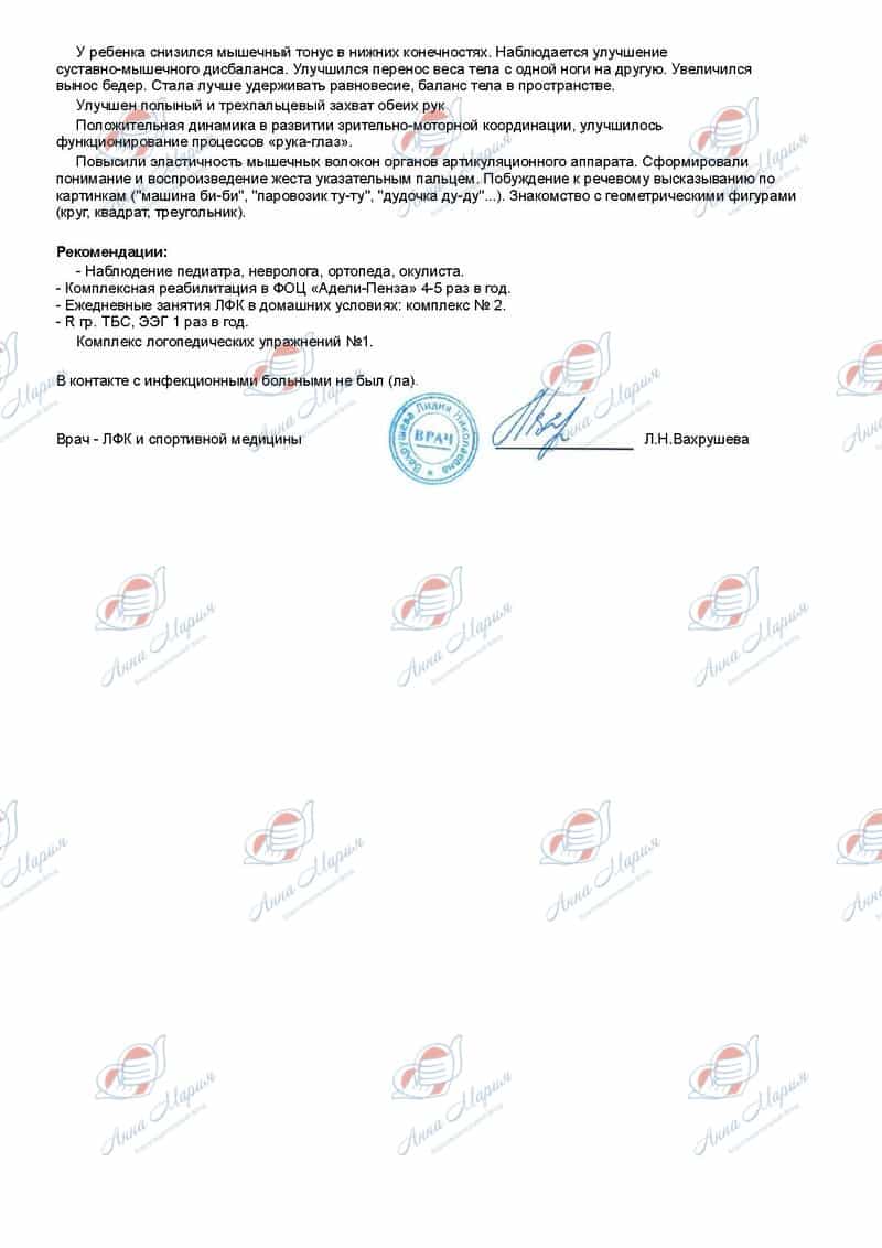 Большая половина этих навыков стала появляться, после прохождения платных курсов реабилитации. Лечение значительно улучшило состояние здоровья девочки. У Ани появилась шаговая реакция и самостоятельная ходьба у опоры, улучшилась мелкая моторика, увеличилась речевая активность! Неврологи оценили состояние ребёнка и выявили очень хороший реабилитационный потенциал. Ане необходима повторная реабилитация.