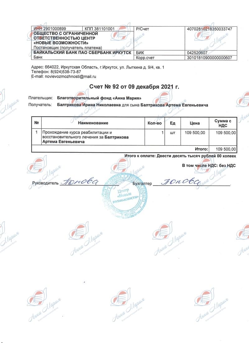 Совсем недавно бабушка узнала о медицинском центре «Новые возможности» в Иркутске, специализирующемся на лечении таких детей как Артем. Она накопила деньги и смогла привезти внука в центр. Своих средств едва хватило на осмотр специалистами и проведение несколько процедур. Артему рекомендован курс восстановительного лечения, где с ним будут плотно работать специалисты ЛФК, Бобат и Войта-терапевты, логопед и нейропсихолог под наблюдением невролога.