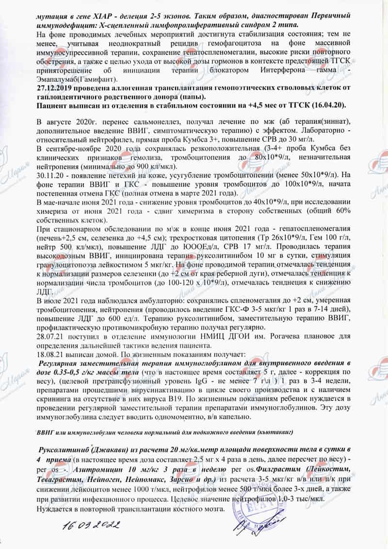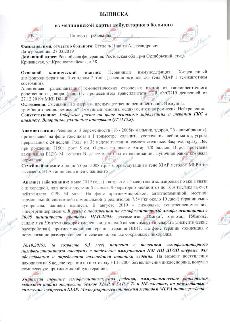 «Постоянный контроль показателей крови Никитки даёт ясную картину: организм сына пытается бороться с инфекциями, но до конца побороть их он не в состоянии, поэтому они повторяются снова и снова. Организм просто не успевает войти в стабильное состояние. И каждый раз идёт игра в смертельно опасную рулетку: дойдёт ли в этот раз до применения гормональных и других тяжелейших препаратов, губительно действующих на внутренние органы? А не дойдёт ли и вовсе до вспышки ГЛГ, где врачи просто не в силах дать никаких светлых прогнозов?