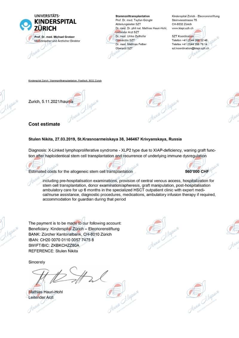 «Но все непредсказуемо. Никто не скажет заранее сможет ли мой Никита держать длительно эти клеточки или нет. Завтра мы прокапаем иммуноглобулин, который должен стабилизировать показатели, и я очень на это надеюсь. Я постоянно на связи с доктором Митиас Хаури Холль и он очень обеспокоен состоянием сына. Врач говорит, что низкий показатель нейтрофилов вполне может быть связан с длительным приемом иммуносупрессии, которая негативно влияет на костный мозг Никиты. Дай Господи, чтобы все обошлось. Пожалуйста, помолитесь за нашего мальчика, за нашего улыбашку. У Никиты есть шанс на жизнь! Пожалуйста, помогите нам его не упустить!»