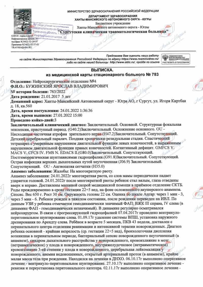 История: Ярослав родился на экстремально недоношенном сроке в 22,5 недели весом 650 гр. Он один из двойни, второй ребенок не выжил. Из-за глубокой недоношенности его легкие не развились. После рождения ребенка сразу подключили к аппарату ИВЛ, в реанимации он провел 1 год и 3 месяца. За год малыш перенес около 15 операций, остановку сердца, бесчисленное количество переливаний крови, наркозов, сепсис, ежедневные рентгеновские снимки. Регулярная пневмония перешла в хронический бронхит, развилась ретинопатия глаз и атрофия зрительного нерва. Не удалось избежать кровоизлияния в мозг 3 и 4 степени, в последствии началась гидроцефалия. В четыре месяца Ярославу провели первую операцию шунтирования для снижения внутричерепного давления и восстановления нормальной циркуляции спинномозговой жидкости. Шунт никак не приживался, организм постоянно отторгал инородный предмет. В итоге было проведено более 10 операций. Затем начались приступы эпилепсии. Ребенок сейчас на регулярном приеме препаратов, которые купируют приступы.