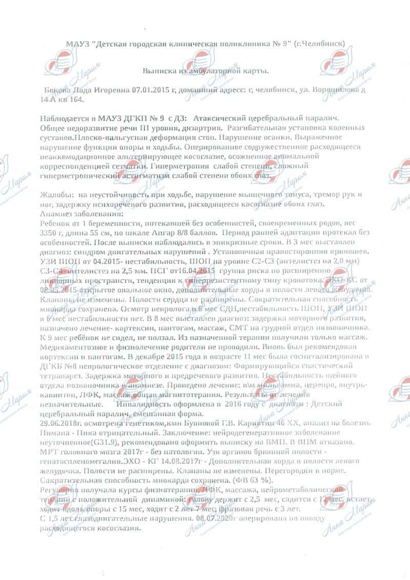 Мама Лады рассказывает: «Для нашей семьи это был шок, но это стало и отправной точкой в нашем лечении и активной борьбе за здоровье дочери и ее полноценную жизнь. На тот момент Лада могла лишь держать голову, переворачиваться и ползать на животе, загребая вперед ручками».