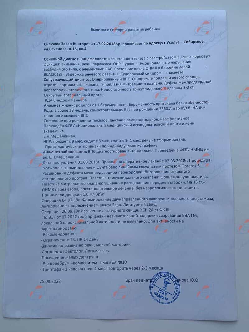 Проблема: Энцефалопатия сочетанного генеза с расстройством высших корковых функций. Задержка речевого развития. Оперированный ВПС. Атрезия аортального клапана.