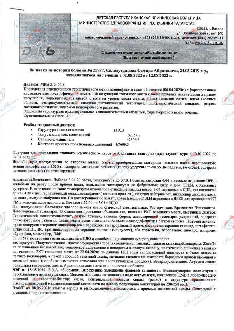 История: С рождением Самира семья Саляхутдиновых приобрела статус многодетной. Старшие дети очень ждали появления младшего брата. Самир родился в срок. Он рос и радовал своими достижениями. Активный и любознательный малыш быстро учился всему новому, рано начал ходить. Брат с сестрой весело играли с Самиром в прятки. Каждое утро Самир провожал брата в садик, а сестру в школу и с нетерпением ждал их возвращения. Малыш рос «не по дням, а по часам», как обычно говорят. Его первый день рождения был незабываемым! Но потом Самир заболел. Многодетные родители на тот момент не могли и подумать ни о чем серьезном, ведь все дети болеют. Симптомы обычной простуды не вызывали опасений. Отмечалось общее беспокойство, озноб, повышение температуры. Но Самир на глазах менялся в худшую сторону. Врачи не знали, как ему помочь, взяли пункцию и обнаружили вирусную инфекцию – герпетический менингоэнцефалит.