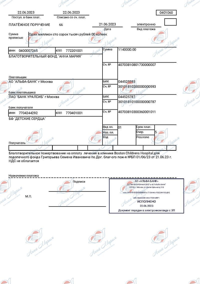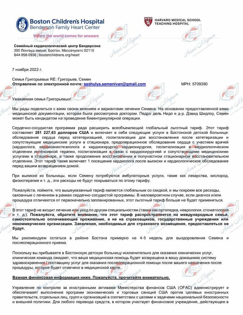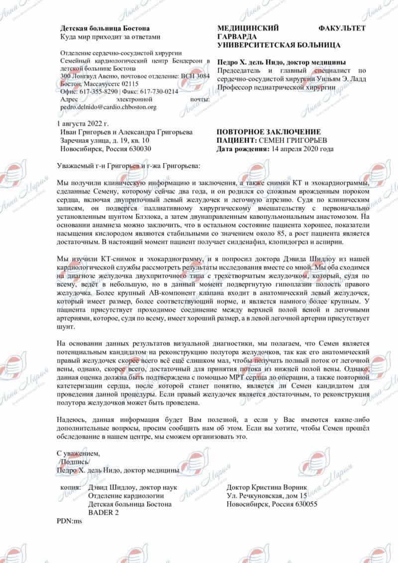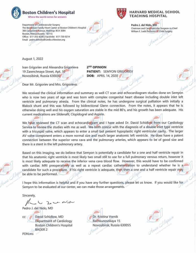 «Привыкание к новому члену семьи – это временное явление, и оно пройдёт, а вот больное сердечко и тяжелое состояние Семёна как исправить?! У нас осталась только последняя надежда – Бостонский детский госпиталь и всемирно известный детский кардиохирург Педро дель Нидо, который исправляет даже самые сложные случаи. Только он сможет восстановить анатомию сердца сына. Чтобы стать для своей сестрички настоящим старшим братом: оберегать и защищать ее по жизни, нашему сыночку надо быть здоровым. Без операции Семён не справится с такой ответственностью потому, что сейчас он сам нуждается в спасении и помощи. Помогите нам, пожалуйста!»