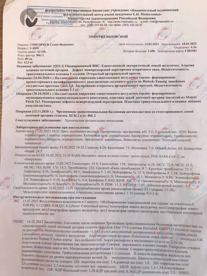 Сейчас Семён прошел очередное плановое обследование, где на УЗИ сердца врачи увидели сократимость единого желудочка. Это означает, что нагрузка на левый желудочек растет. Напомню, что правый желудочек у нас очень мал и, практически, не выполняет свою функцию. Показатели приближаются к критическим, сатурация стала падать! Это означает, что затягивать с операций больше нельзя! Приближается тот возраст, когда Семену просто жизненно необходима операция, ведь паллиативное вмешательство - все сделанное до этого - это всего лишь временное поддержание жизнеспособности ребенка…