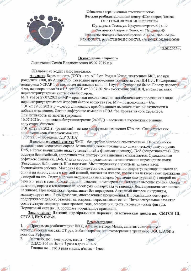 В мае 2022 года Семену сделали селективную дорсальную ризотомию (СДР) в США в г. Сент-Луис, штате Миссури у доктора Парка. Данная операция избавляет ребенка от спастики в ногах.