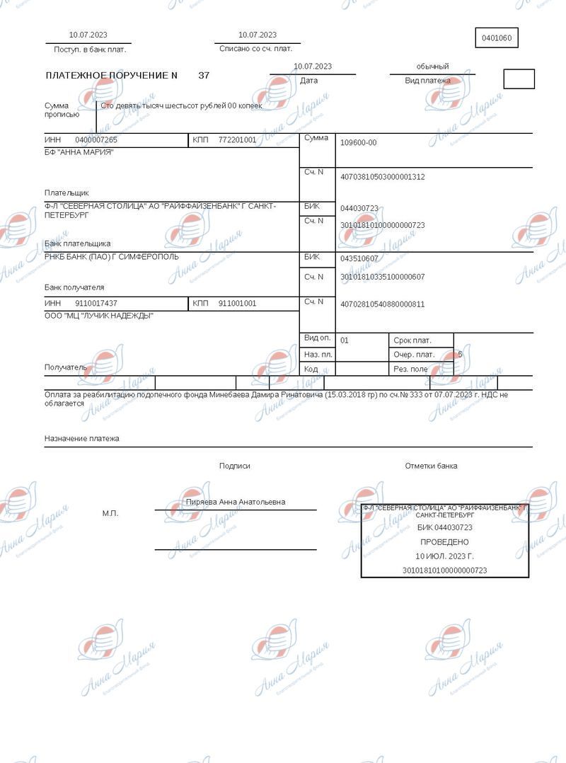 Трансплантация костного мозга в клинике «Медицинский центр Хадасса», Израиль, 255 000,00 долларов США. Частичный сбор – 5 000 000,00 (пять миллионов) рублей.