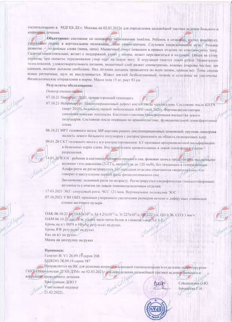 После многочисленных консультаций в НМИЦ Бурденко, РДКБ, Морозовской ДГКБ, врачами был поставлен предварительный диагноз «Артериовенозная мальформация» (АВМ) – состояние, при котором между артериями и венами вместо сети капилляров появляются патологически извитые шунтирующие сосуды. Принято решение не проводить хирургического вмешательства, а продолжать наблюдать за состоянием девочки.