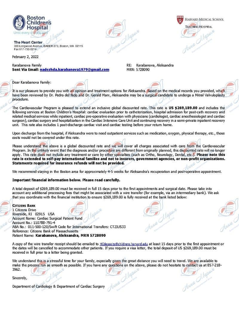 «Я звонила в клинику и умоляла перенести сроки госпитализации. Направила новые обследования и рассказала о состоянии Саши. Доктор был очень обеспокоен состоянием дочки, и сообщил, что операцию необходимо провести как можно быстрее. Дольше тянуть уже нельзя… Госпитализация назначена на 7 апреля. Остаток к сбору еще очень большой - больше половины от общей суммы счета за операцию! Сейчас очень сложное время в стране и в мире в целом, многое изменилось. Но мы не имеем права сказать в лицо нашей дочке, что ничего не будем делать, потому, что это очень страшно, дорого и далеко! Мы очень хотим спасти нашу девочку!»