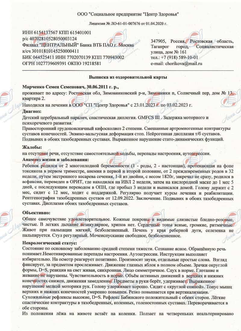 Семен чувствует себя хорошо, настроение приподнятое. Мама старается ежедневно заниматься с сыном - прогулки, вертикализация, иппотренажор, беговая дорожка. Также мама Семена ездила за путевкой в санаторий для сына. Поэтому Семену в скором времени предстоит прием у травматолога, рентген тазобедренных суставов, ЭКГ и УЗИ органов пищеварения.