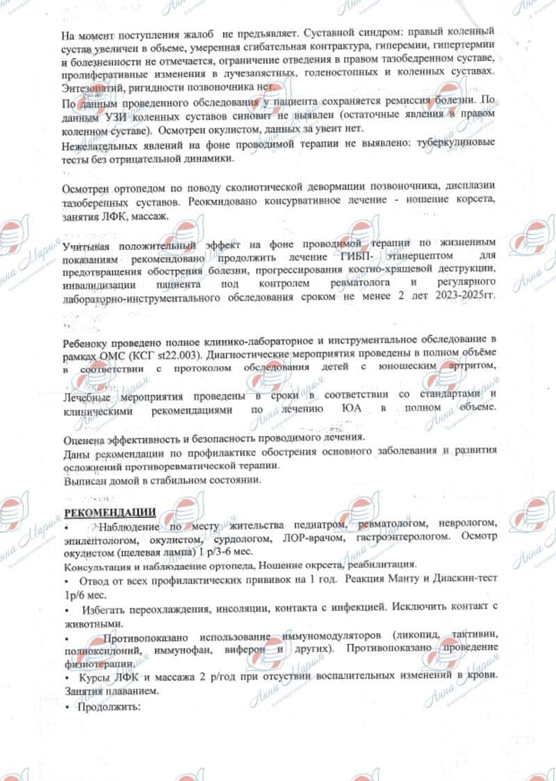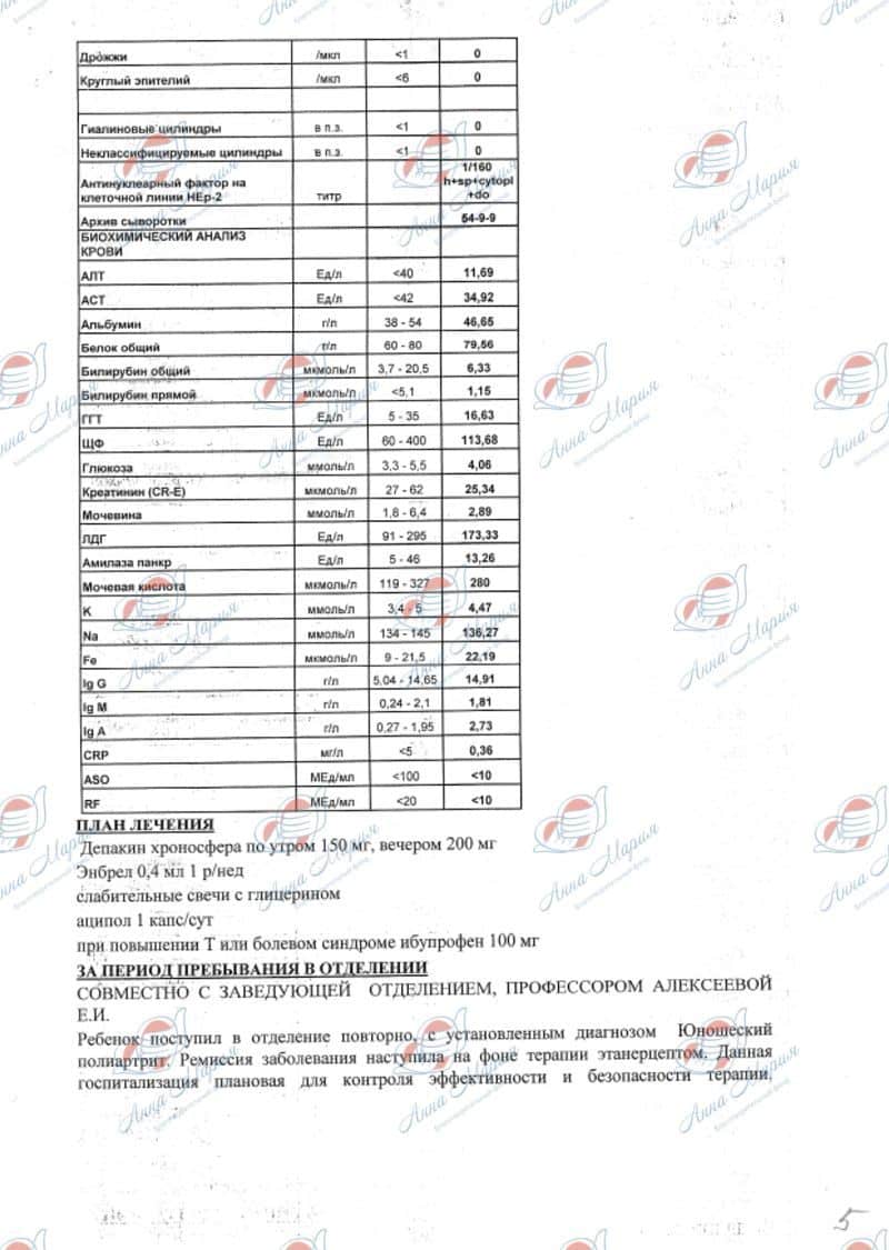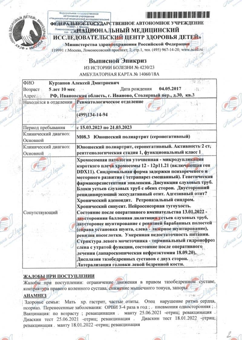 Алёша сдавал общий анализ крови и биохимию, результаты анализов хорошие. Данные анализы мальчик сдаёт раз в месяц для контроля состояния суставов – для своевременного возможного предотвращения воспаления. Также Алеша продолжает ходить в бассейн и на ЛФК. На занятиях он очень старается!