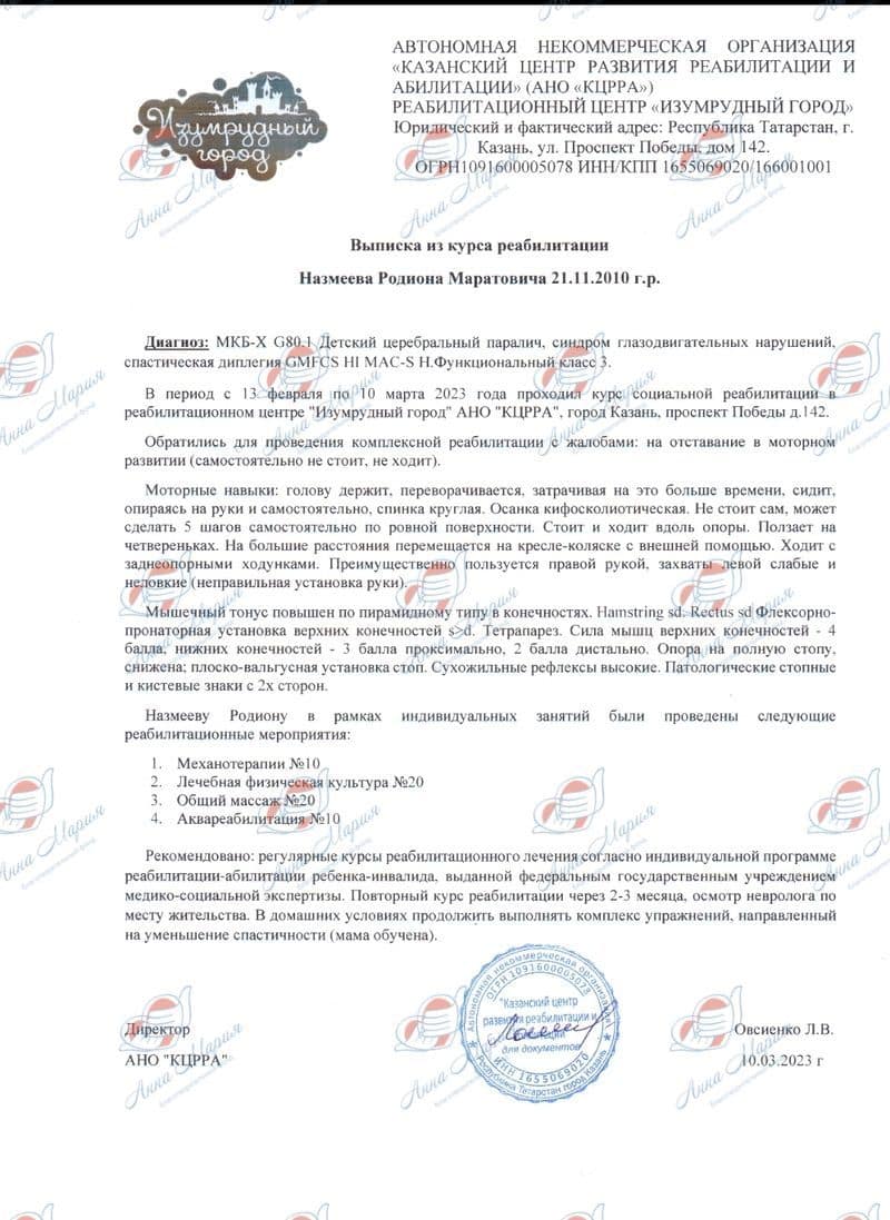 После систематических курсов лечения мой мальчик стал лучше себя обслуживать. Теперь он сам частично одевается и раздевается, может застегнуть и расстегнуть пуговицы. Для нас это еще одна победа. Родион стал более мобильным - может подойти на ходунках к лавке, развернуться и самостоятельно сесть. Сынок очень старается. Ему хочется научиться ходить самостоятельно. Реабилитация стоит огромных для нашей семьи денег и лечить ребенка без материальной поддержки нет возможности.