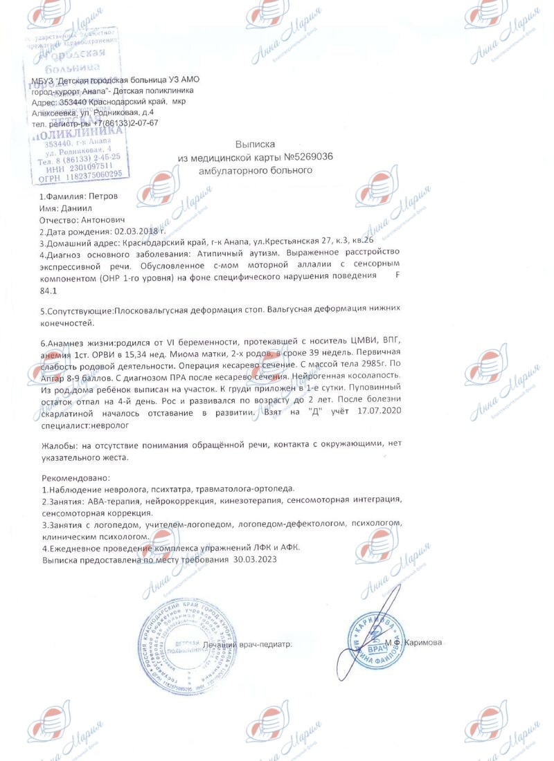 По поведенческим нарушениям врачи поставили ребенку диагноз «расстройство аутистического спектра» (аутизм) и дали инвалидность на один год по неврологии, а в четыре года - инвалидность по психиатрии до 18 лет.