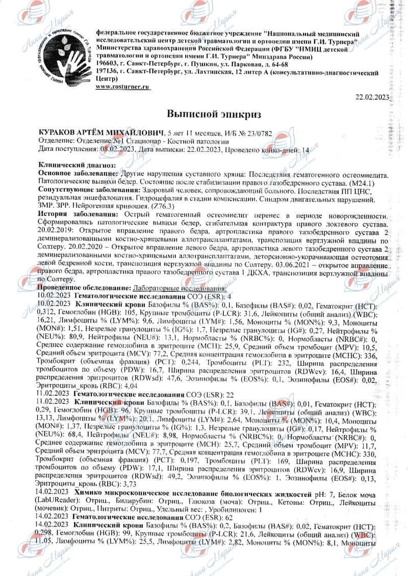 Долгожданная выписка наступила через 2,5 месяца с диагнозом - дисплазия тазобедренного сустава (ТБС) и деформация правого локтевого сустава. По началу малыша пытались вылечить консервативными методами. Артема загипсовали на месяц, а потом рекомендовали носить разные шины и распорки. Но это лечение не давало результатов. Тогда Артёма повезли на консультацию в НМИЦ им. Г.И. Турнера в г. Санкт-Петербург. Консилиумом врачей принято решение исправлять вывихи ТБС оперативным путем.