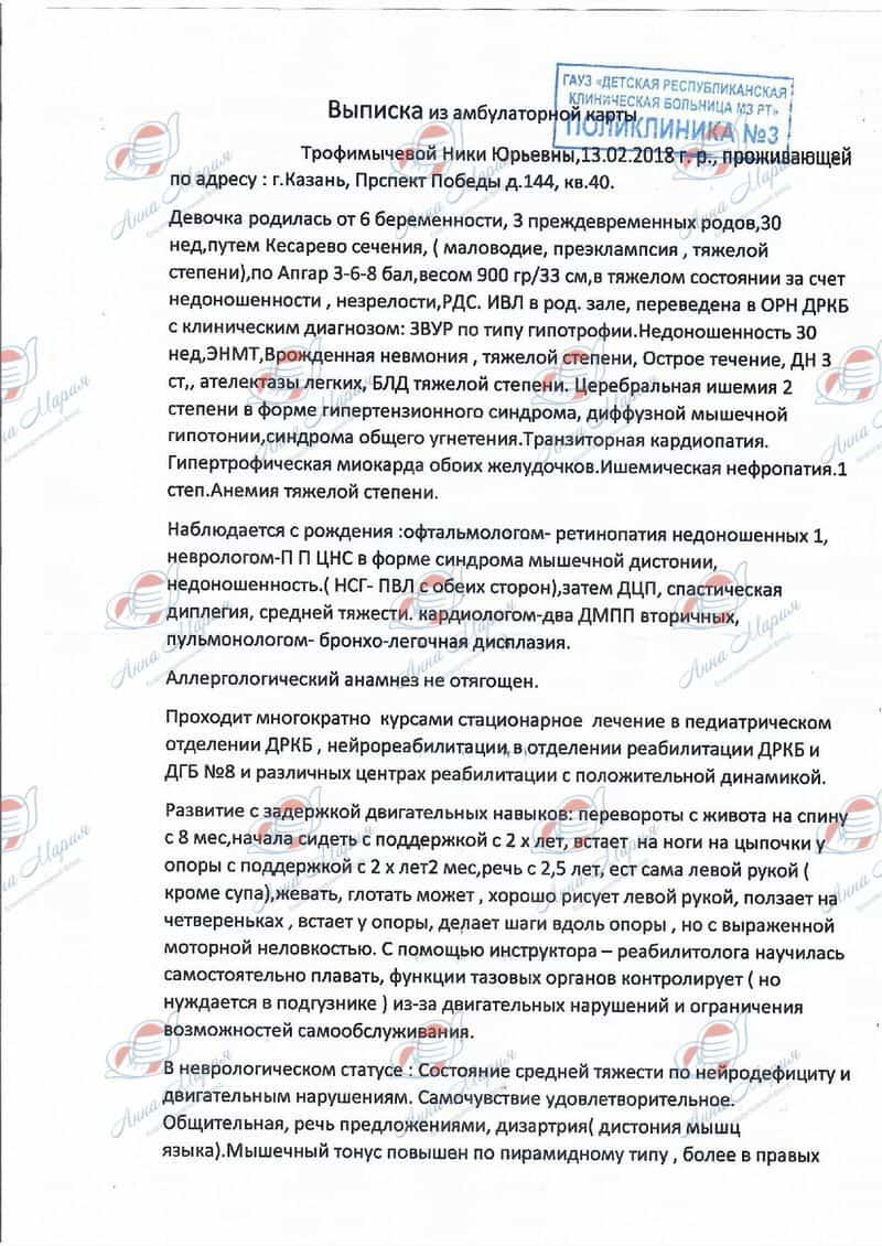 Ника подрастала, набирала вес, но вовремя не перевернулась, не держала голову, не села и не поползла. В десять месяцев врачи поставили диагноз ДЦП. Как только оформили инвалидность, началась активная реабилитация и поиск хороших специалистов для девочки. На тот момент семья жила в небольшом городе Нурлате, где нет возможности полноценно заниматься с Никой. Приходилось ездить на реабилитации в другие города, что требовало немалых средств. Тогда родители сделали решительный шаг и переехали в Казань. Возможностей для реабилитации здесь несравнимо больше.