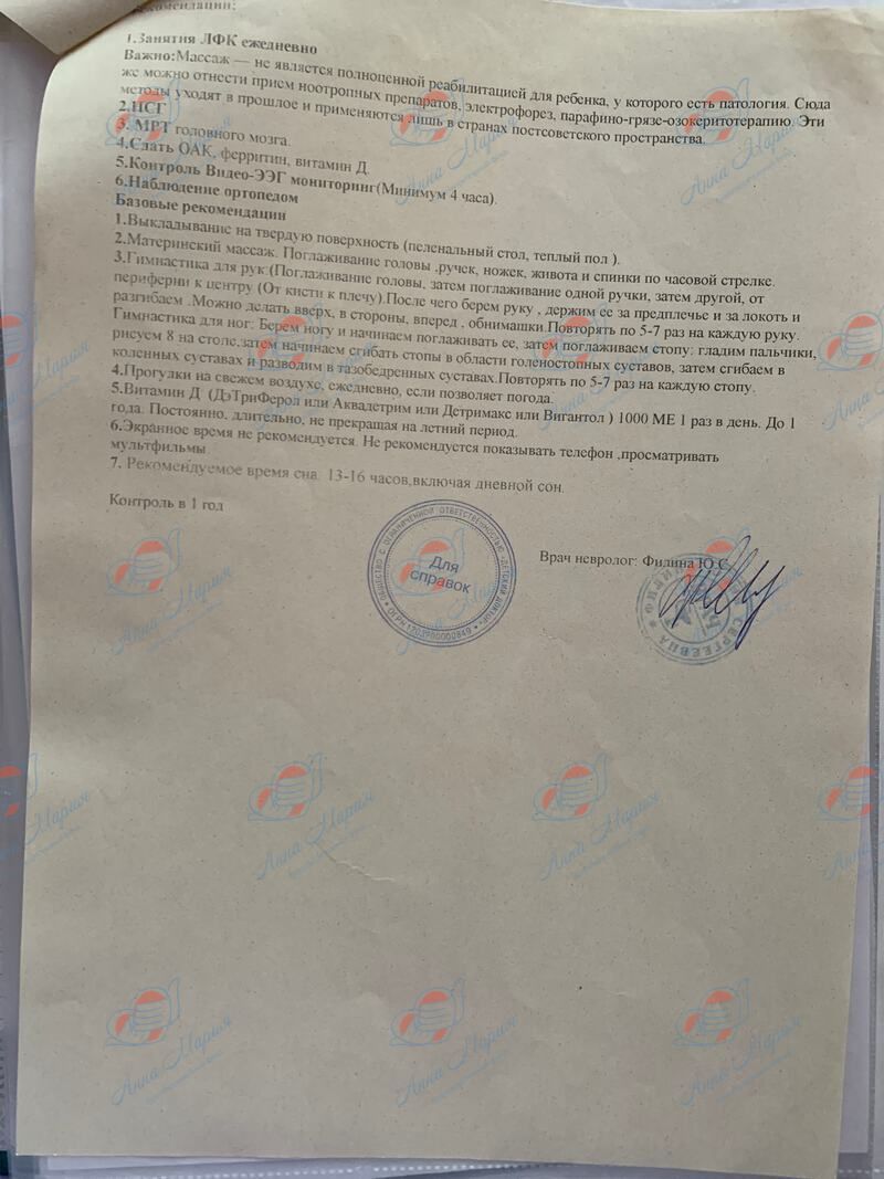 История: Вследствие тяжелой гипоксии в родах у Рустама выявлена перивентрикулярная лейкомаляция (ПВЛ). Изменения в головном мозге при такой патологии носят необратимый характер. Медики предупредили маму о последствиях ПВЛ и назначили ребенку восстановительное лечение.