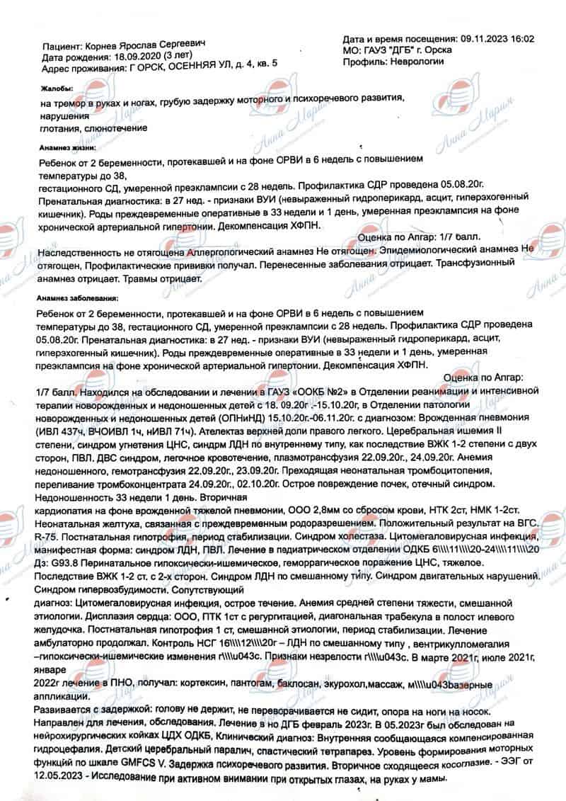В свои три года Ярослав сам не сидит, не переворачивается, плохо держит голову, кушает только мягкую пищу, задыхается от ветра на прогулках. Тем не менее занятия со специалистами дают положительные результаты. После нескольких курсов лечения сын научился сидеть в специальном стульчике и коляске, немного лучше стал держать голову. Ребенку нравится слушать песенки, он понимает много слов, любит наших домашних кошек, знает, как их зовут и всегда им улыбается. Ярослав с удовольствием занимается на виброплатформе. Самое любимое занятие Ярослава - разговаривать с бабушкой по видеосвязи.