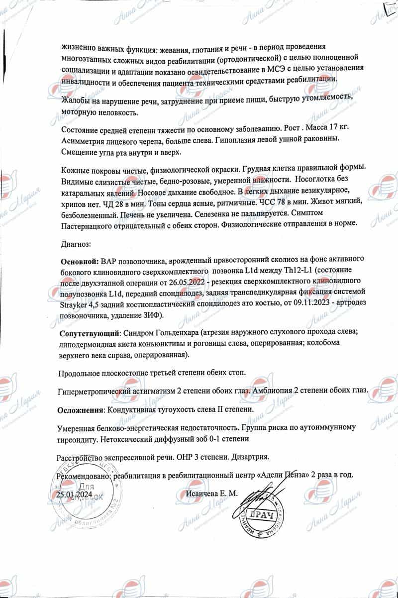 У Сони кондуктивная тугоухость слева II степени, порок развития нижней челюсти, микротия III степени. Асимметрия нижней челюсти привела к неправильному развитию остальных структур лицевого скелета девочки. Ребенку трудно жевать, нарушены речевые функции. У Сони наблюдается стойкое снижение зрения на обоих глазах.