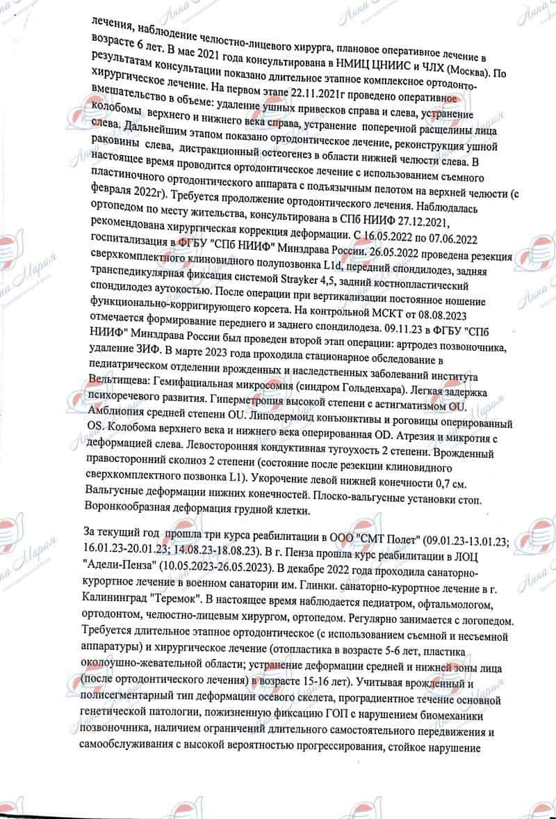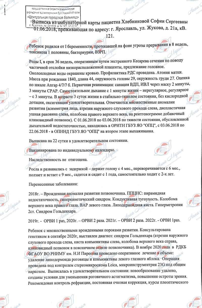 Девочка перенесла множественные операции по удалению липодермоидной кисты в левом глазу, иссечению колобомы верхнего века справа, устранению расщелины губы. Также у Сони был обнаружен при рождении добавочный клиновидный полупозвонок между грудным и поясничным отделом, оперированный в 2022 году.