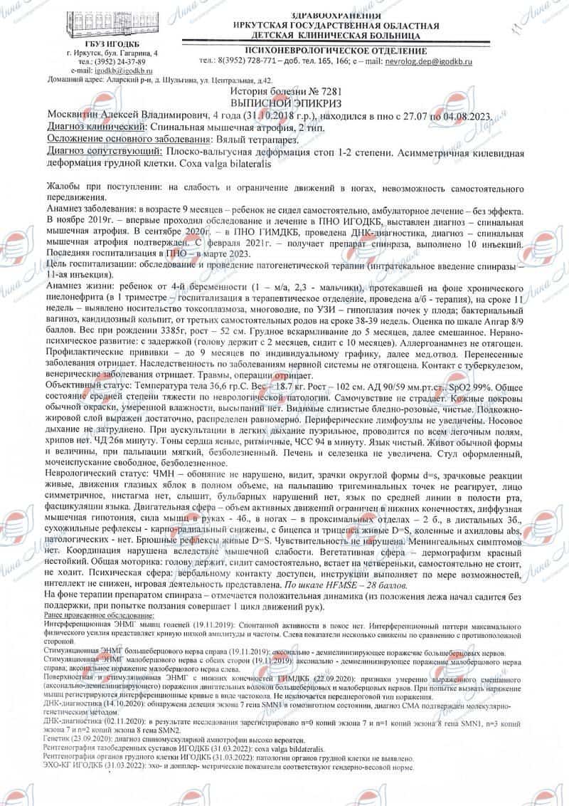 Трансплантация костного мозга в клинике «Медицинский центр Хадасса», Израиль, 255 000,00 долларов США. Частичный сбор – 5 000 000,00 (пять миллионов) рублей.