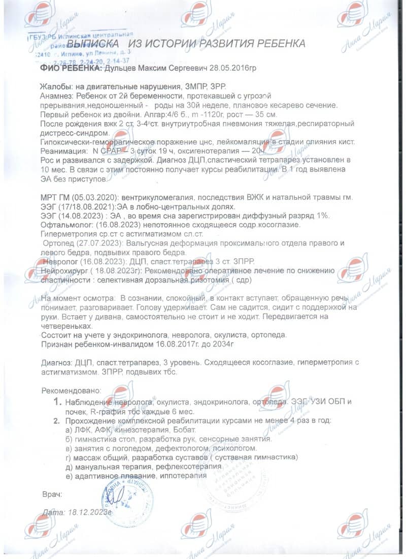 Сегодня Максиму 7 лет. В ближайшее время ему необходимо будет провести плановую операцию на позвоночнике – селективную дорзальную ризотомию. Она нужна для того, чтобы снизить уровень спастичности мышц. После операции также потребуется интенсивная реабилитация в течение года для получения новых навыков.