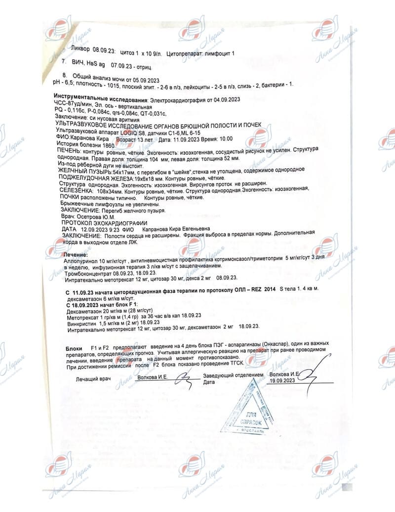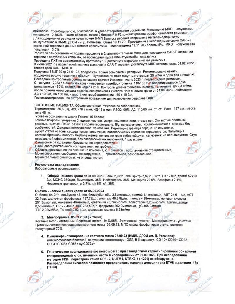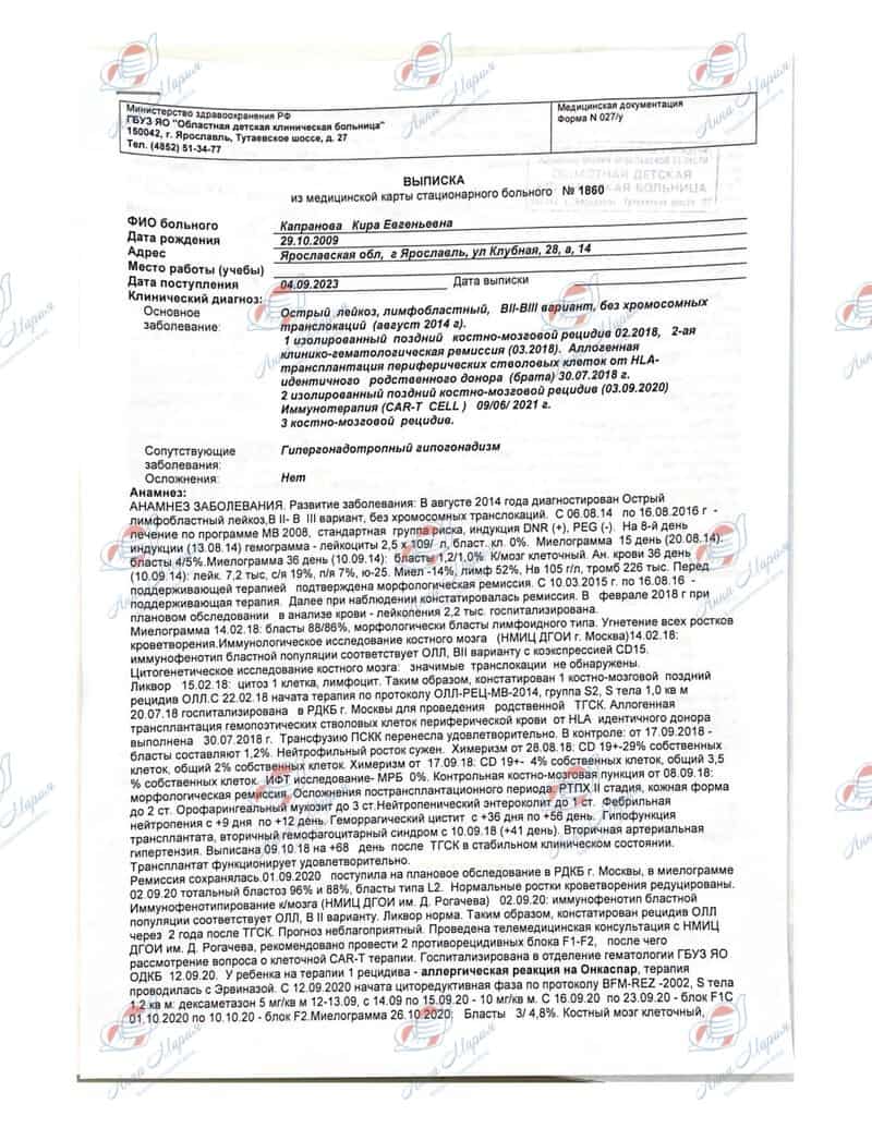 В сентябре 2020г. врачи в Москве заявили, что при данном заболевании они сделали все, что могли – дали максимальное лечение по протоколу. А в сентябре 2023г. после CAR-T терапии, которую Кира прошла в клинике Sheba, случился третий рецидив.
