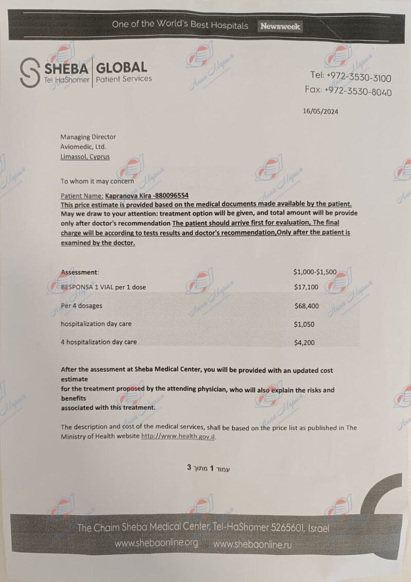 В качестве выхода из ситуации клиника Sheba Medical Center в Израиле предложила провести лечение препаратом Inotuzumab с последующей трансплантацией костного мозга от неродственного 100% донора. Кира стойко перенесла и этот этап, несмотря на сложный послеоперационный период. После профессоры клиники созвали консилиум, чтобы обсудить дальнейшие меры. По итогу они заявили, что ситуация крайне тяжелая и это редкость – три рецидива и две пересадки костного мозга для ребенка.