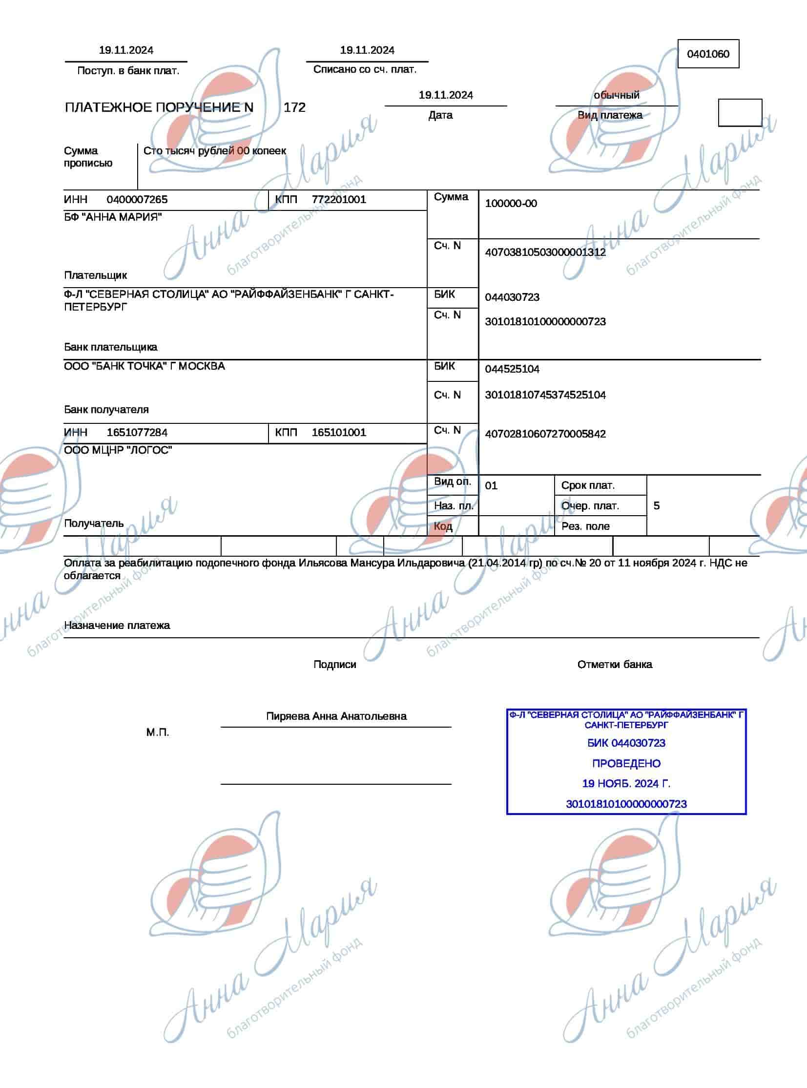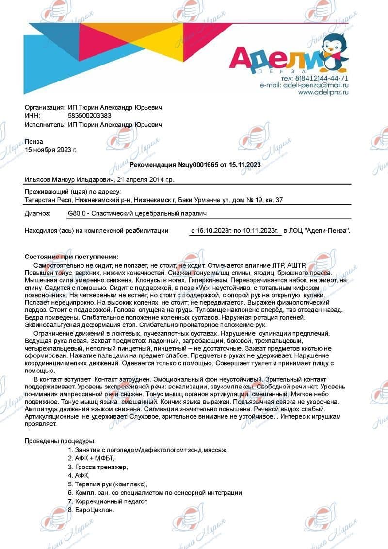 За 10 лет Мансур прошел большое количество реабилитаций в России и за рубежом. Все они дали положительный результат. Врачи рекомендуют не останавливаться и двигаться дальше. Сейчас ему необходимы занятия, чтобы снять спастику и восстановить двигательные функции. Мечта родителей Мансура – приложить все усилия, чтобы сын смог научиться ходить или хотя бы играть с братом. Для этого нужно пройти очередной курс реабилитации в ООО «МЦНР «Логос». У семьи нет денег на оплату лечения – мама Мансура обратилась за помощью в благотворительный фонд «Анна Мария».