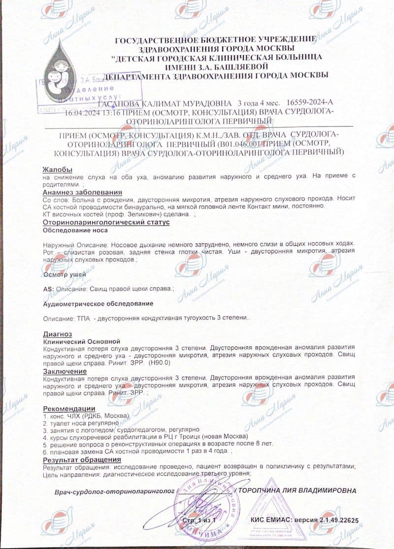Для родителей это был настоящий удар – они не могли поверить, что такая беда постигнет семью. В 4 месяца Калимат прошла КСВП (обследование) у Л.В. Торопчиной, больница им. Башляевой в Москве. Там ей поставили вторичный диагноз – двусторонняя атрезия слуховых проходов, двусторонняя микротия, кондуктивная тугоухость 3 степени. Врачи объяснили, что эта аномалия крайне редкая. Она встречается у 1 новорожденного на 10000 детей. При том, что из общего числа больных на тугоухость это всего лишь 10%.