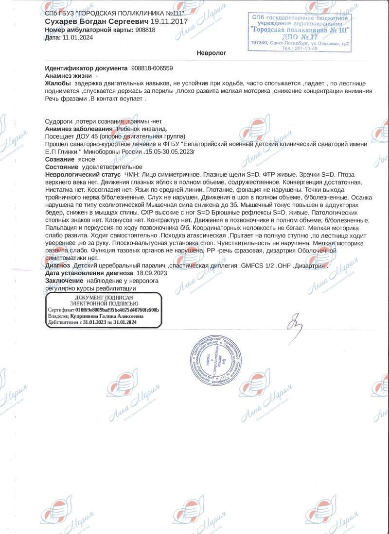 Далее последовало 8 курсов реабилитации в СПБ ГБУЗ ДГБ «Святой Ольги». Врачи отмечали положительную динамику. Диагноз поставили в 1 год. Богдан с опозданием начал выполнять элементарные действия: держать головку, переворачиваться из стороны в сторону, вставать на четвереньки. В 7 месяцев он начал ползать по-пластунски. На ножки впервые встал в 1 год 8 мес., сделал первые шаги – в 2 года 3 мес.