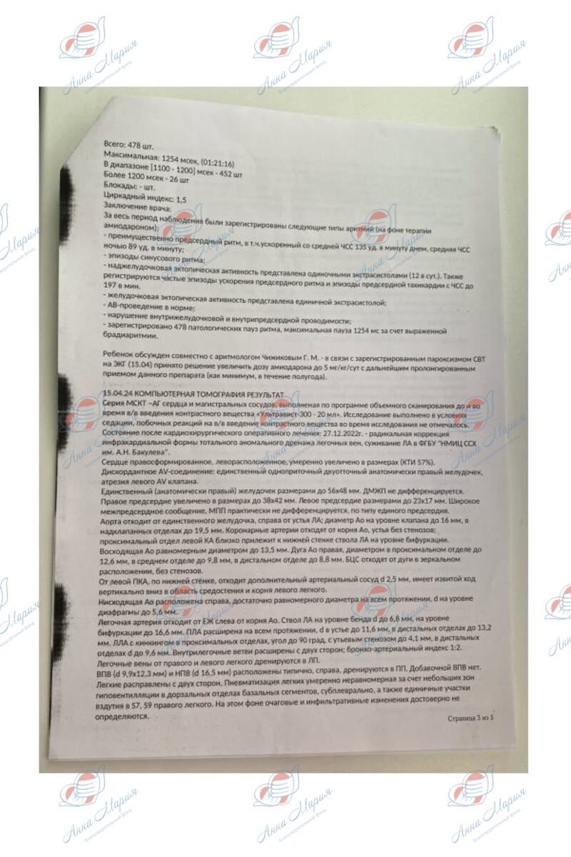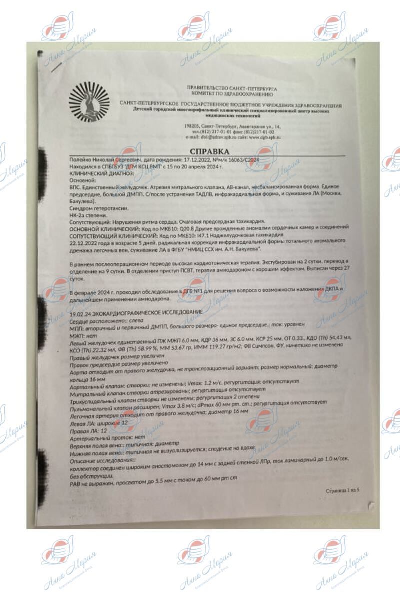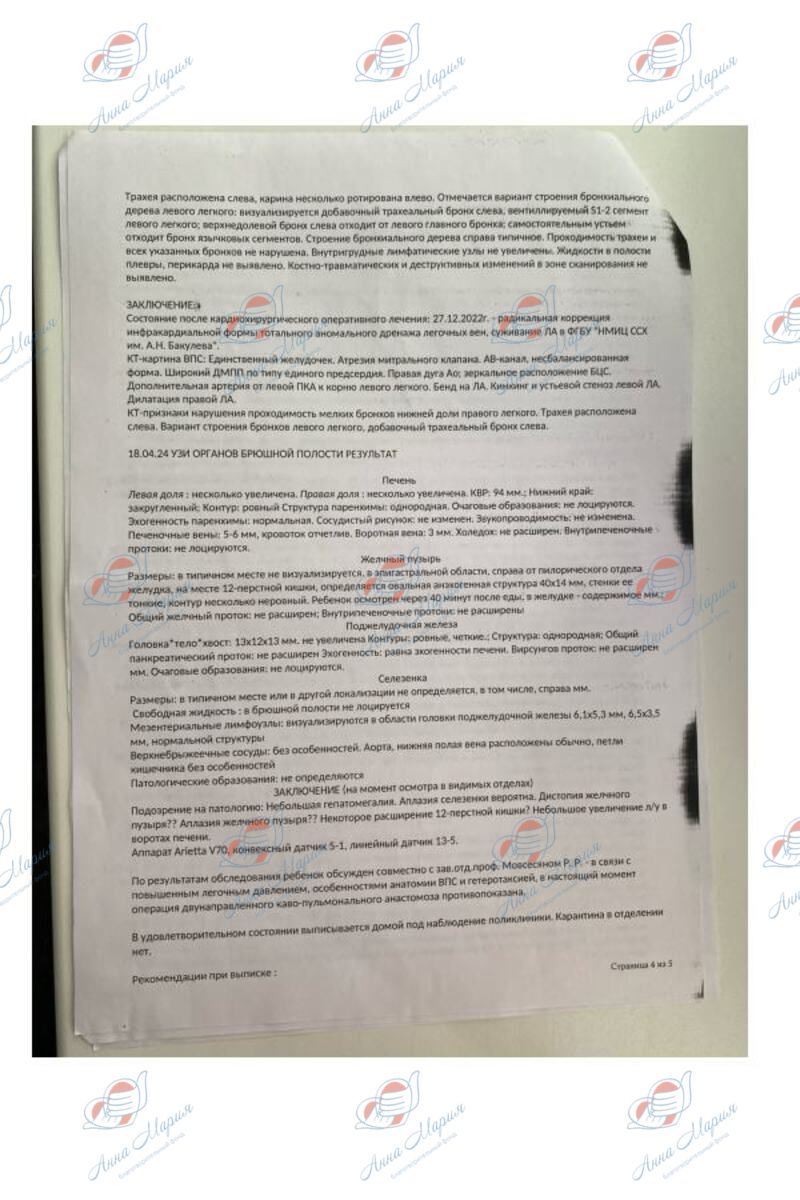 По факту госпитализации на операцию была проведена диагностика – УЗИ и КТ брюшной полости, где врачи обнаружили гетеротоксию, зеркальное расположение внутренних органов. В операции было отказано. Семья начала консультироваться в других кардиоцентрах России, но также везде получали отказ в терапии.