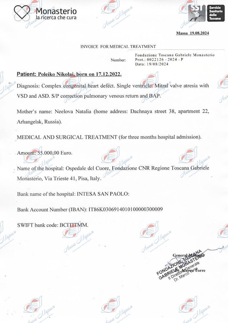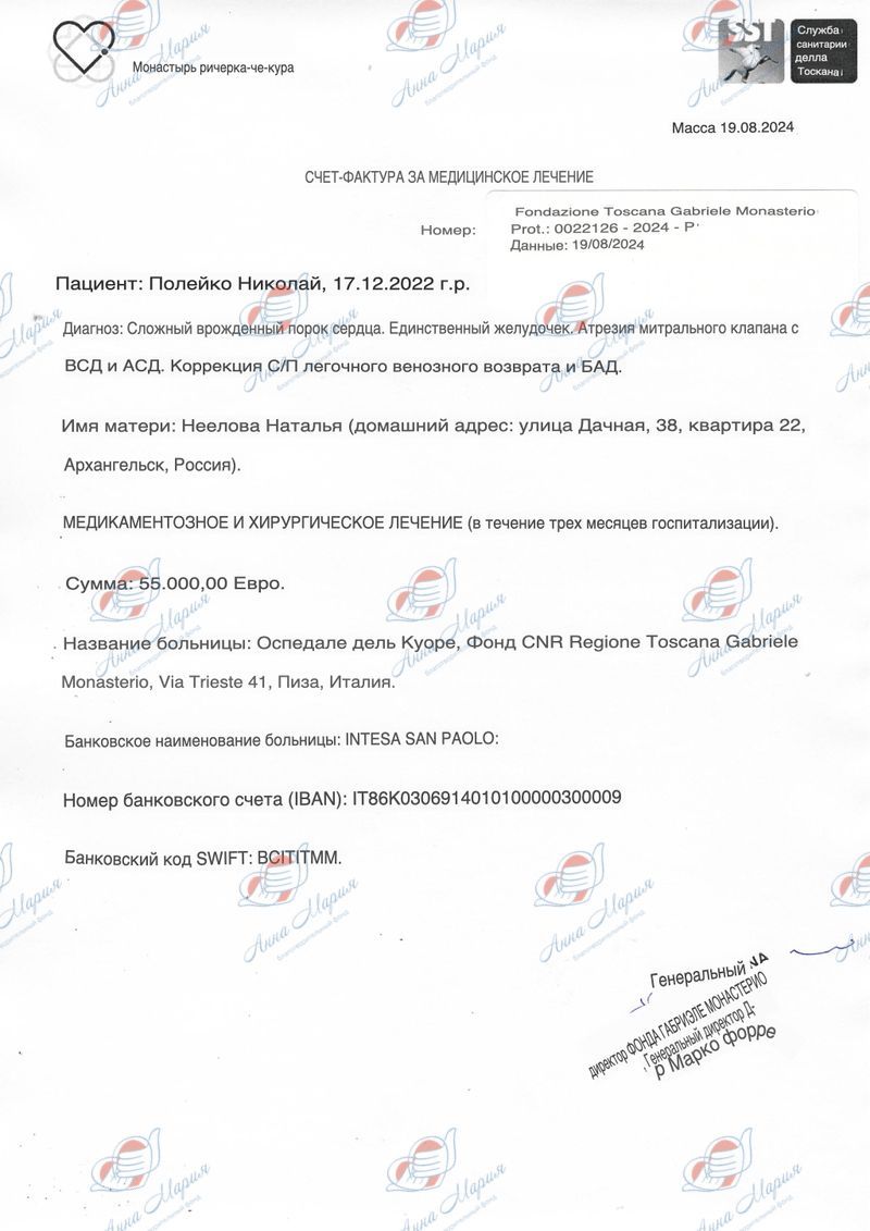 В интернете нашлись контакты известной клиники в Италии, куда родители Коли отправили результаты диагностики – медицинскую выписку, УЗИ, КТ и прочее. Изучив историю болезни, врачи предложили варианты лечения и согласились провести операцию. Однако ее стоимость запредельно высокая – 55 000 евро.