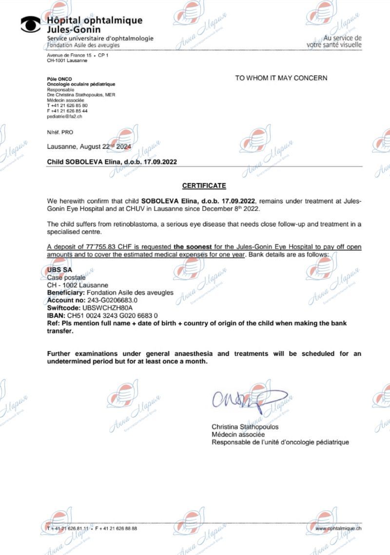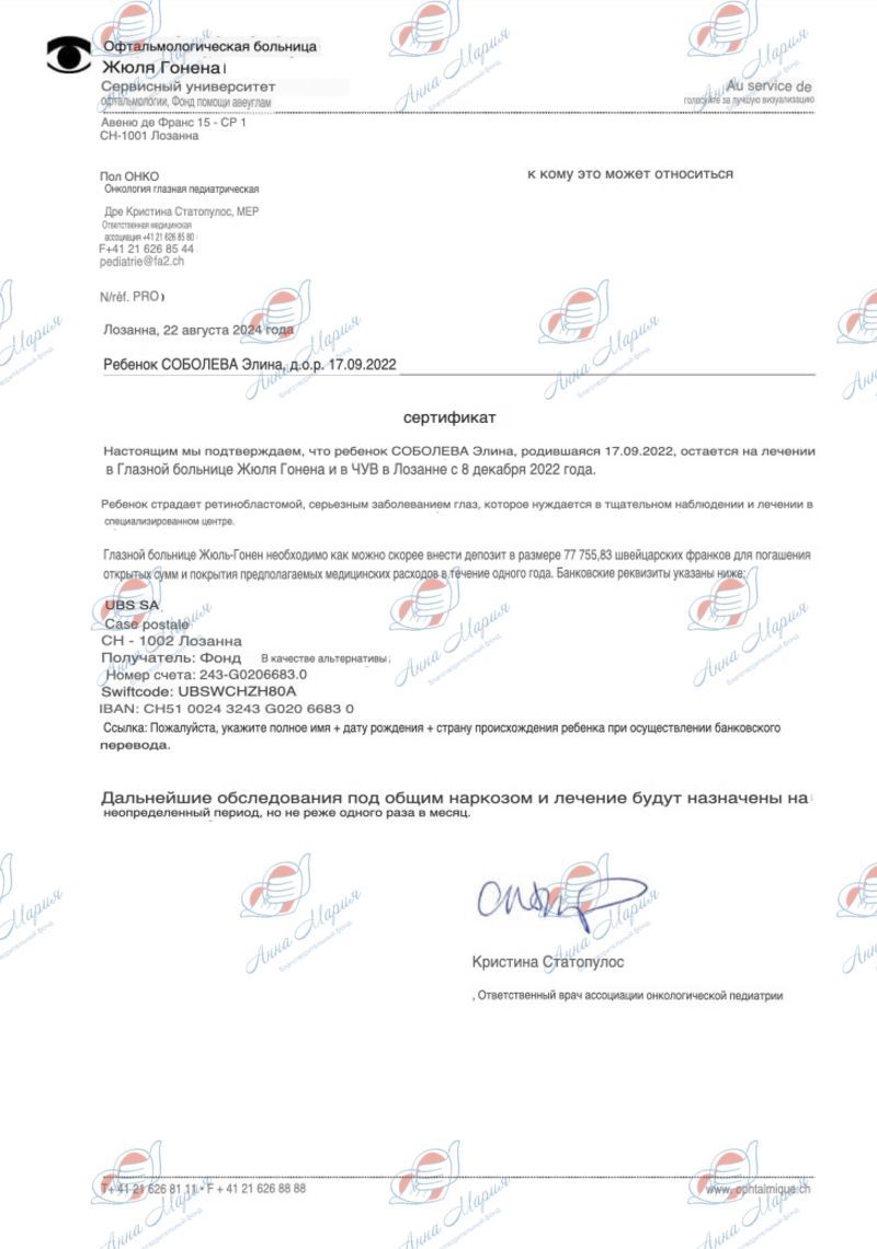 За два года она прошла семь курсов химиотерапии в Швейцарии, после которых ее самочувствие постепенно улучшалось, в отличие от результатов лечения в клинике онкологии имени Н.Н. Блохина. Рецидивы становятся все меньше. Чтобы не упустить момент и вовремя отреагировать на изменения в самочувствии, девочке необходимо посещать клинику каждый месяц, и так – до достижения 5 лет. На диагностику и лечение уходит много денег – родители не справляются с финансовой нагрузкой самостоятельно.