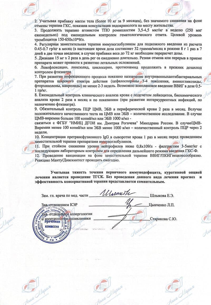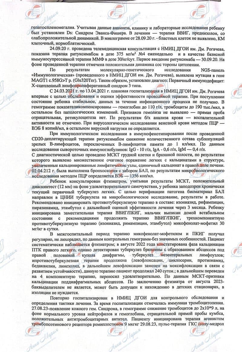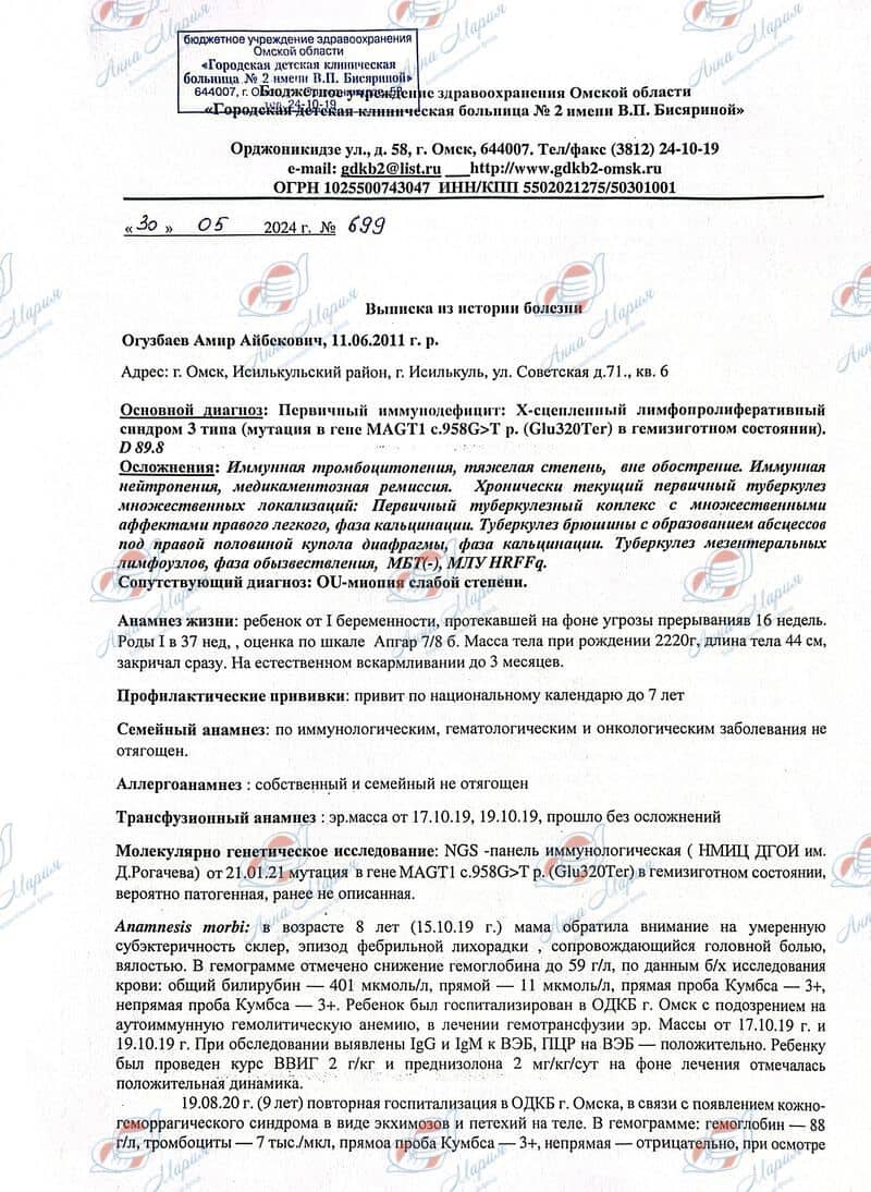 Очередной диагноз, который они поставили – синдром Фишера–Эванса. Это очень редкая болезнь, которая характеризуется сочетанием ИТП и АИГА. Позже по результатам анализов в Москве врачи сообщают, что причиной всех заболеваний является мутация в гене, первичный иммунодефицит. В 2021г. у мальчика нашли туберкулез легких. По их мнению, если бы диагноз был выявлен ранее, то многих сопутствующих болезней можно было бы избежать. В такой ситуации могла бы помочь терапия иммуноглобулинами.