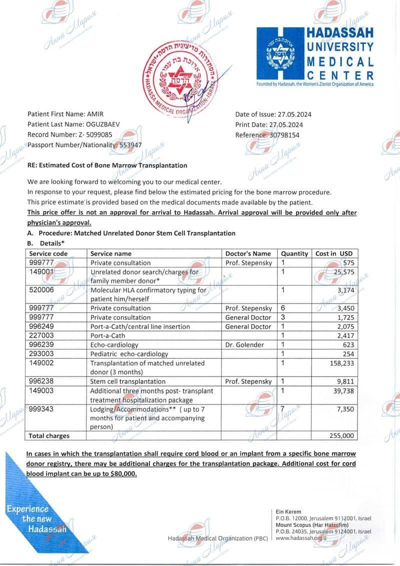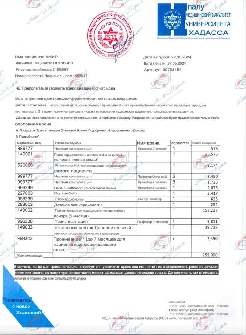 Следующий этап лечения – это операция по трансплантации костного мозга в Израиле. Из-за необходимости поиска неродственного донора, который подойдет на 100%, в России такую операцию сделать не могут. Семья просит помощи у посторонних людей – давайте вместе соберем деньги на лечение Амира в Израиле!