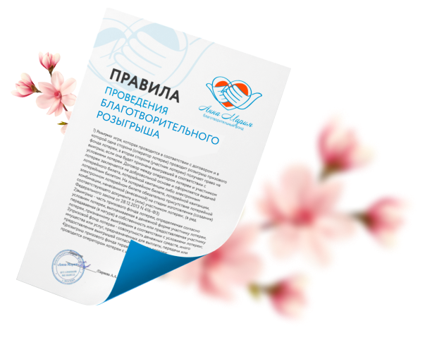 Настоящие Правила проведения благотворительного розыгрыша на сайте Благотворительного фонда «Анна Мария» определяют порядок, условия, место и сроки проведения благотворительного розыгрыша БФ «Анна Мария» для физических лиц (далее – Правила).