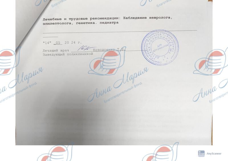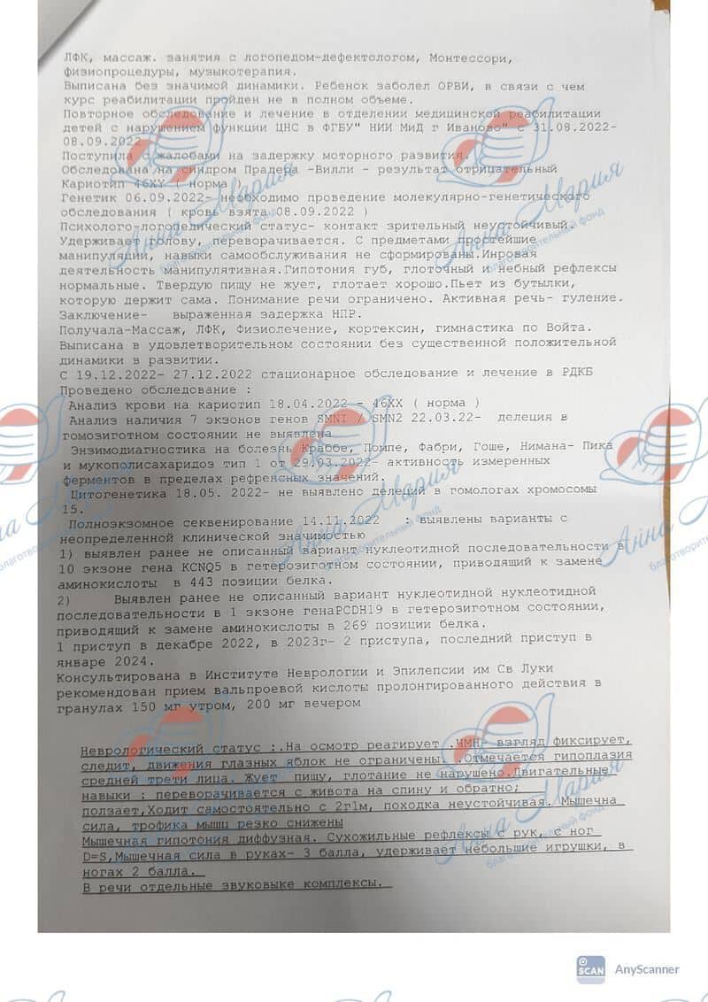 На тот момент задержка в развитии, как физическая, так и психологическая, уже была очевидна. Семья посетила много врачей, в том числе в НИИ материнства и детства, г. Иваново. Там специалист настоятельно рекомендовал сделать генетические тесты.