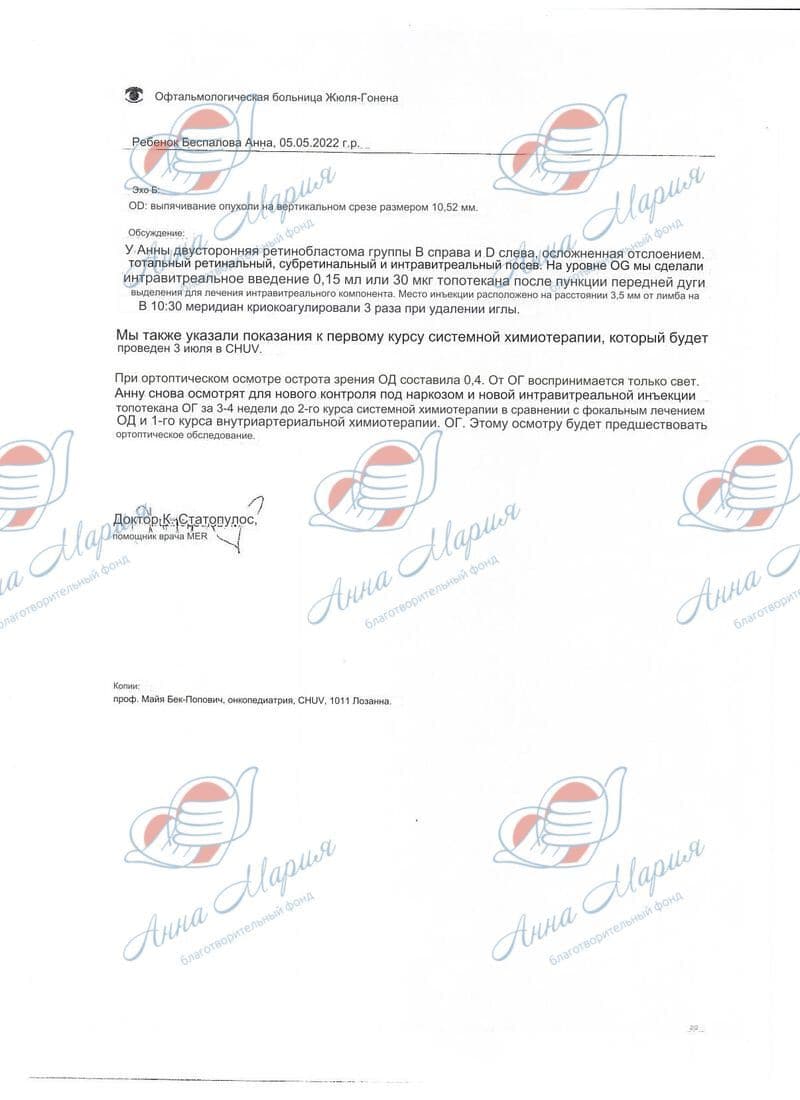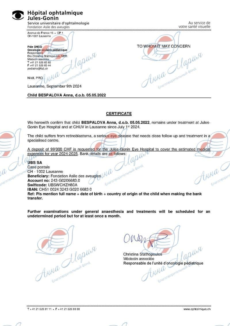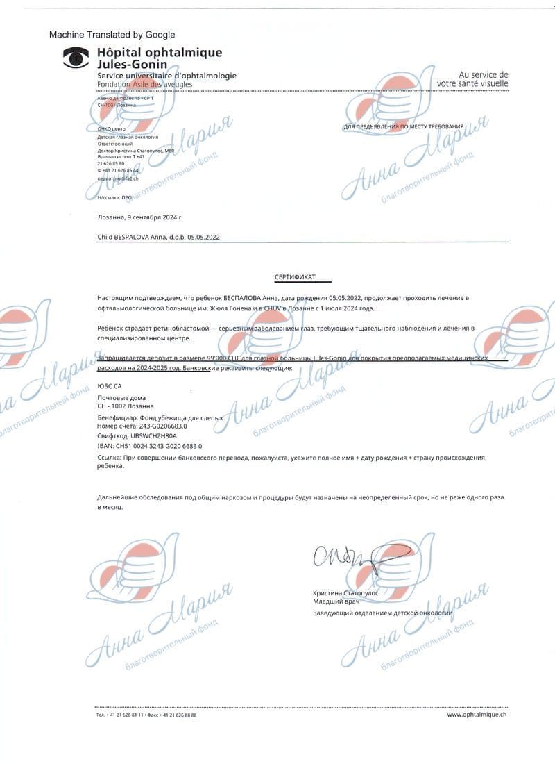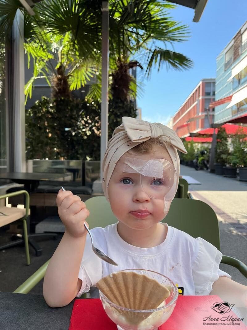 Клиника The Jules-Gonin Eye hospital в Швейцарии приняла запрос и отправила приглашение на лечение. Хирурги согласились оказать помощь – на данный момент Аня уже прошла два курса общей химиотерапии. Результат оказался обнадеживающе положительным – опухоль с левой стороны спала, хотя именно левый глазик был поражен сильнее всего. Кроме того, сетчатка заняла свое естественное положение.