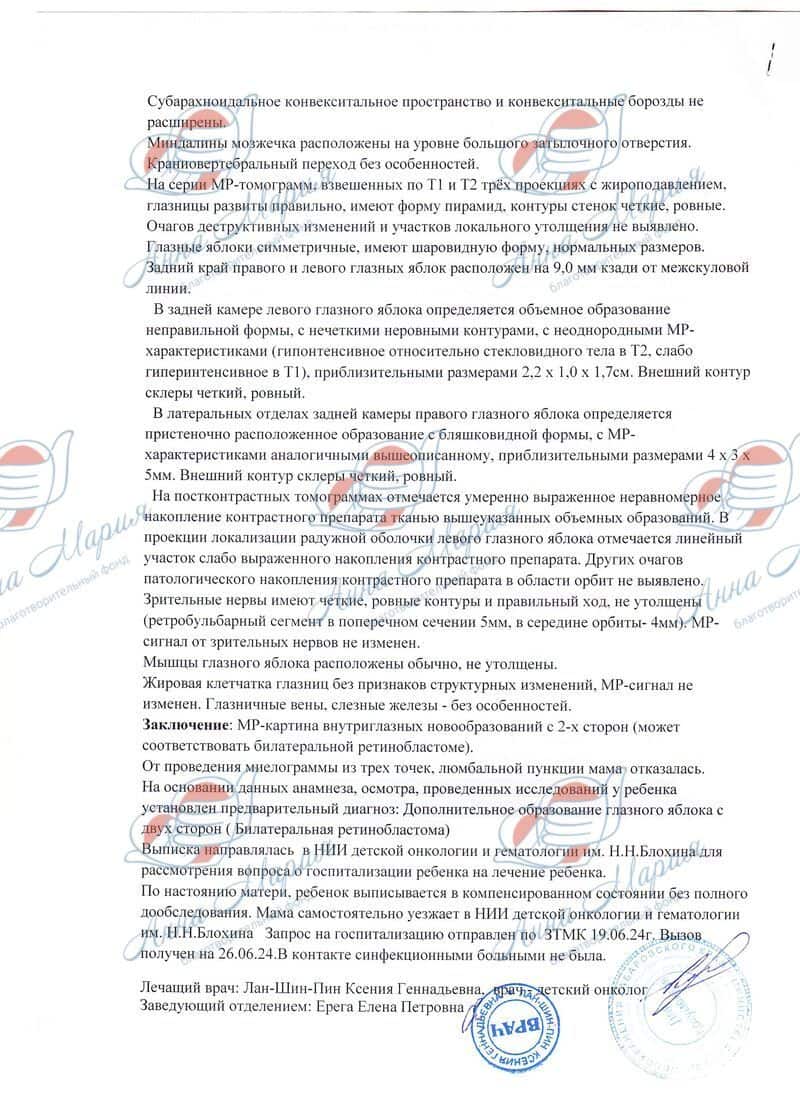 После диагностики клиника поставила неутешительный диагноз – билатеральная ретинобластома обоих глаз. Это злокачественное образование, которое формируется на сетчатке глаза, а затем распространяется за ее пределы. При прогрессировании метастазы могут проникнуть в костный мозг, головной мозг, лимфатические узлы, другие органы.