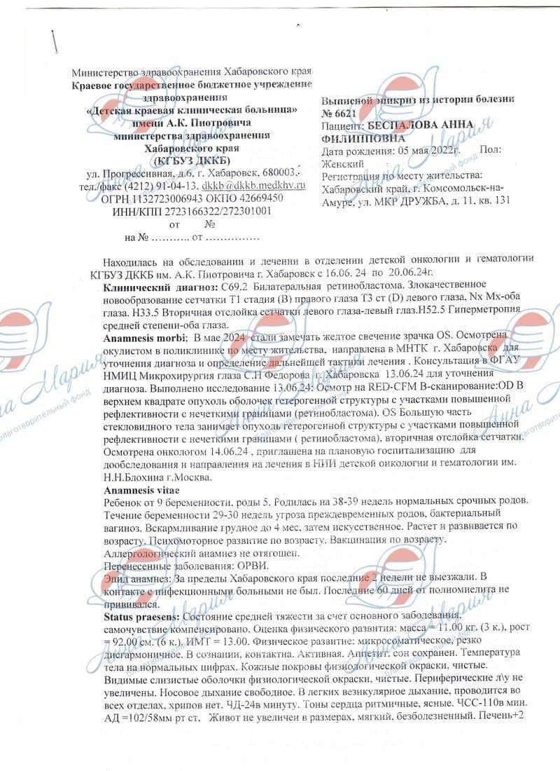 Девочку сразу направили в отделение онкологии детской краевой клинической больницы, город Хабаровск. Там она еще раз прошла обследование, в результате которого специалист заявил, что нужно быть готовым к тому, чтобы удалять глазик. Далее семья столкнулась с рядом трудностей и сделала вывод, что в России с этим заболеванием Ане помочь не смогут. Они вынуждены были обратиться за помощью в зарубежные клиники.