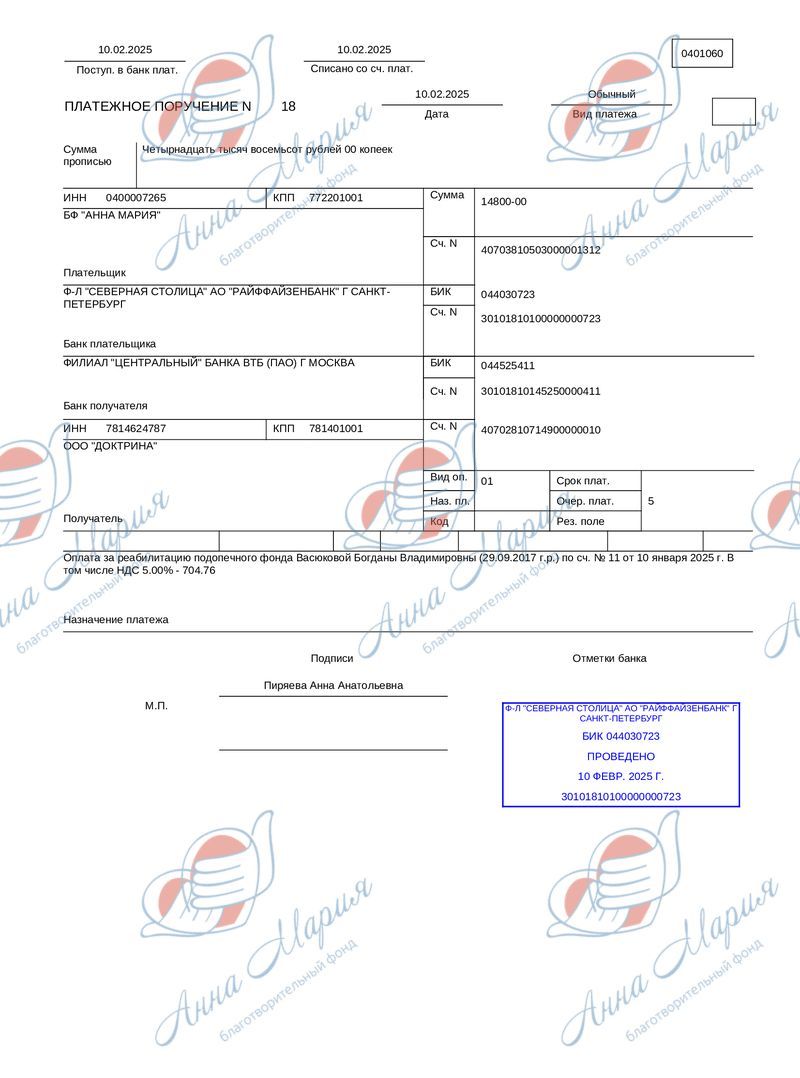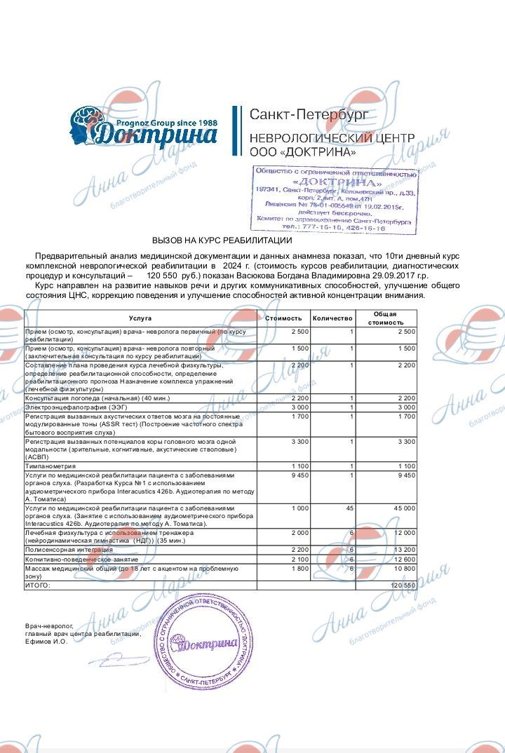 В благотворительный фонд «Анна Мария» обратилась Светлана. Ее дочке Богдане исполнилось 7 лет, и она нуждается в курсе реабилитации в ООО НЦ «Доктрина».