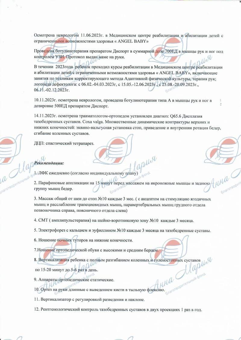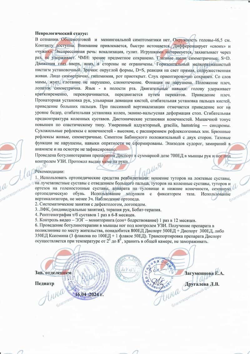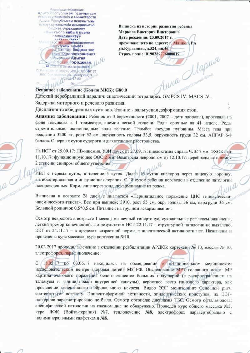 Рекомендации врачей строго выполнялись – девочка проходила лечение в АРДКБ и в платных центрах. Позже ее возили на обследование в Москву, в НЦЗД. МРТ показало повреждения, которые находились на двигательных зонах мозга. Вика сильно отставала в развитии от сверстников. В 1,2 года ей присвоили статус – ребенок-инвалид до 18 лет.