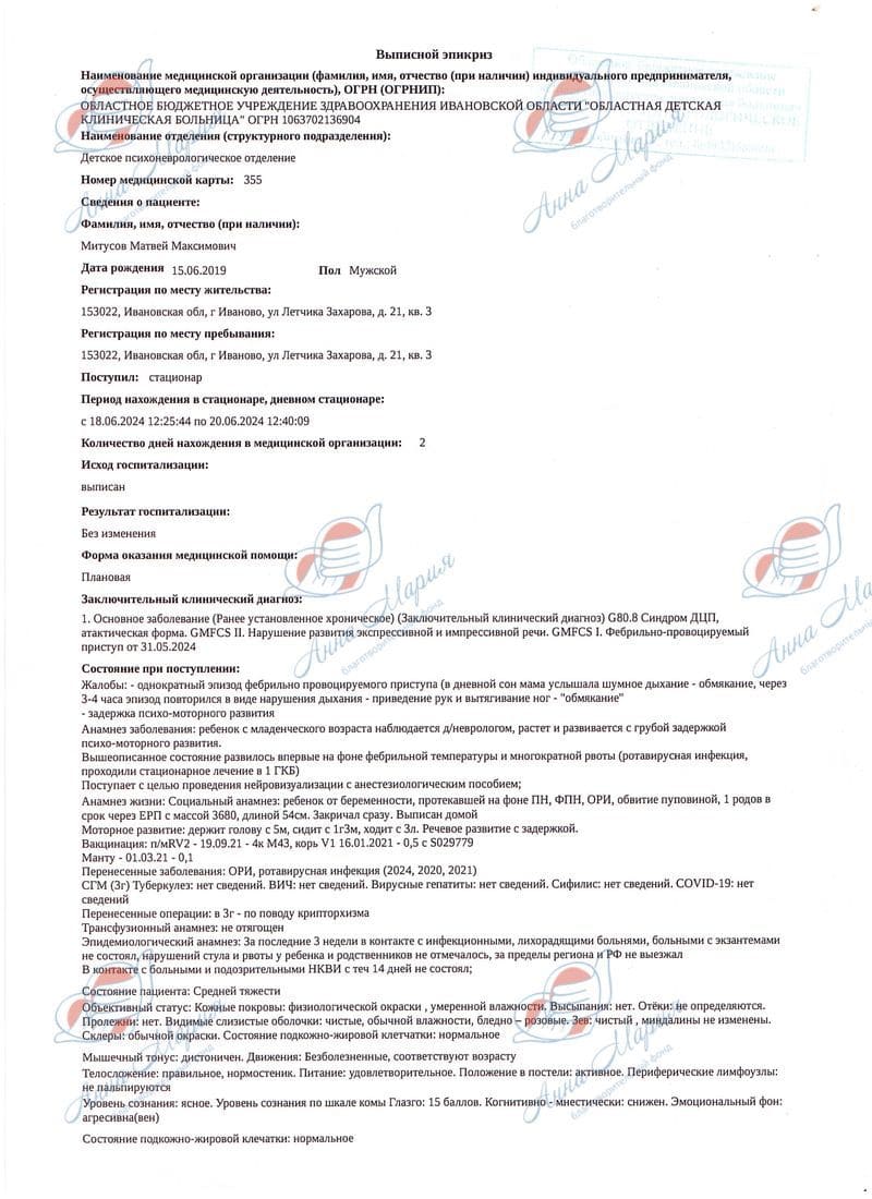 Держать голову он научился только к 5 месяцем, ползать по-пластунски – к 9 месяцам. К году жизни он не умел ходить и даже сидеть. Узнав это, врач из местной поликлиники забил тревогу и выписал направление на консультацию в неврологию. В следующие месяцы было пройдено два курса лечения, которые дали результат.
