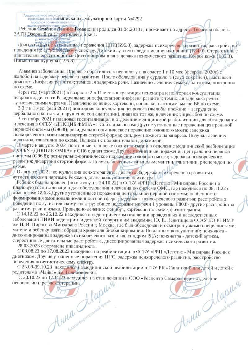 Чтобы разъяснить ситуацию, родители обратились к врачам. Почти все говорили, что «еще рано, ничего, это же мальчик, подождите». Также они назначали разные препараты. Даня принимал их, но особых улучшений в его самочувствии не было.