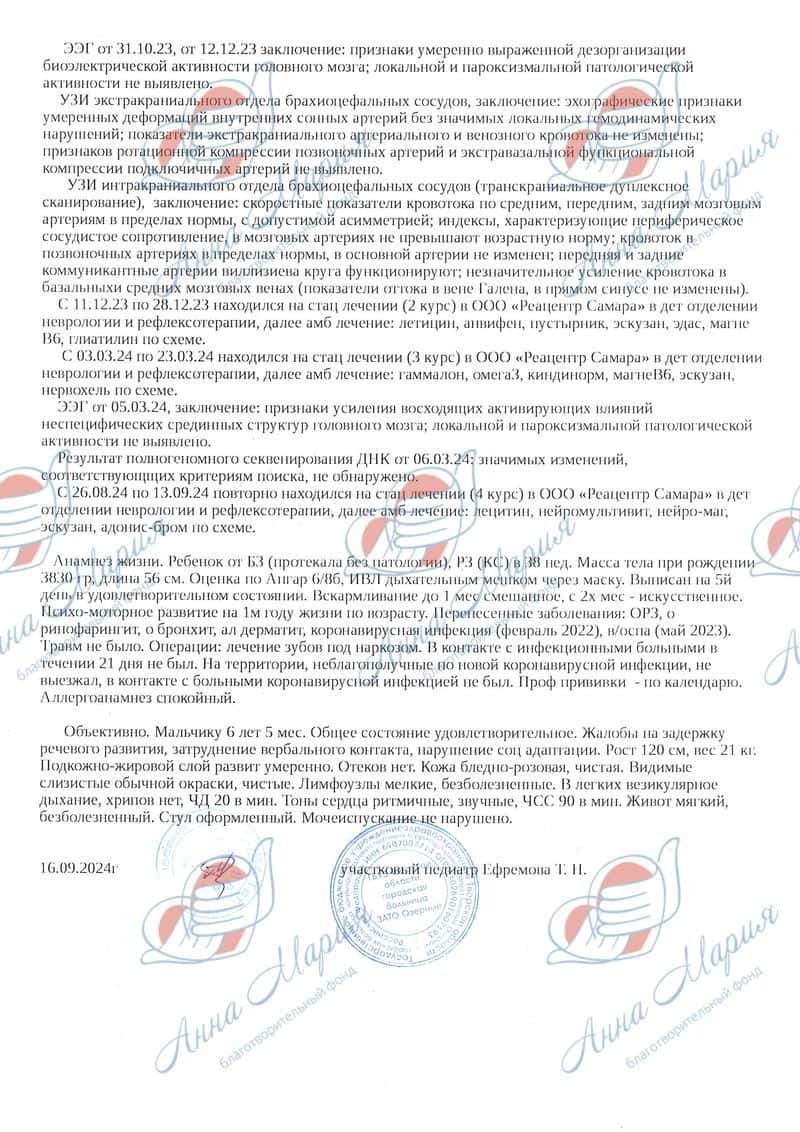 За 2023-2024 гг. Даня прошел четыре платных курса по восстановлению в ООО «Реацентр Самара». Ему назначали микротоковую рефлексотерапию, он занимался с разными специалистами – и это дало результат! Даня начал отвечать на вопросы, научился держать ручку самостоятельно, ездить на 4-х колесном велосипеде. Сейчас он посещает обыкновенный сад, еще через год пойдет в школу, также обычную.