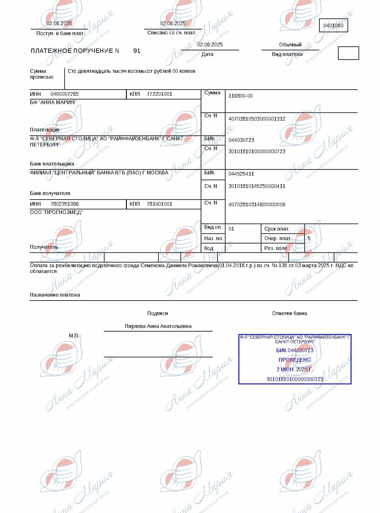 На данный момент Дане требуется курс реабилитации в ООО «Доктрина» г. Санкт-Петербург. Врачи назначили новые процедуры: БАК, ТКМП, Интай. Первый курс будет проходить с 31.10.2024г., далее – в 2025г. Сумма за лечение – 119 800 руб. К сожалению, для семьи это очень большие деньги. Если вы сделаете пожертвование в пользу нашего подопечного, Даня сможет пройти необходимый для него курс лечения!