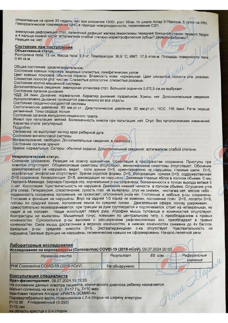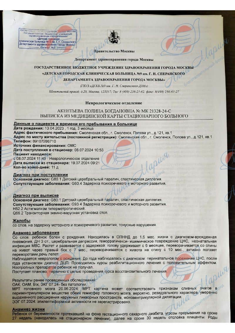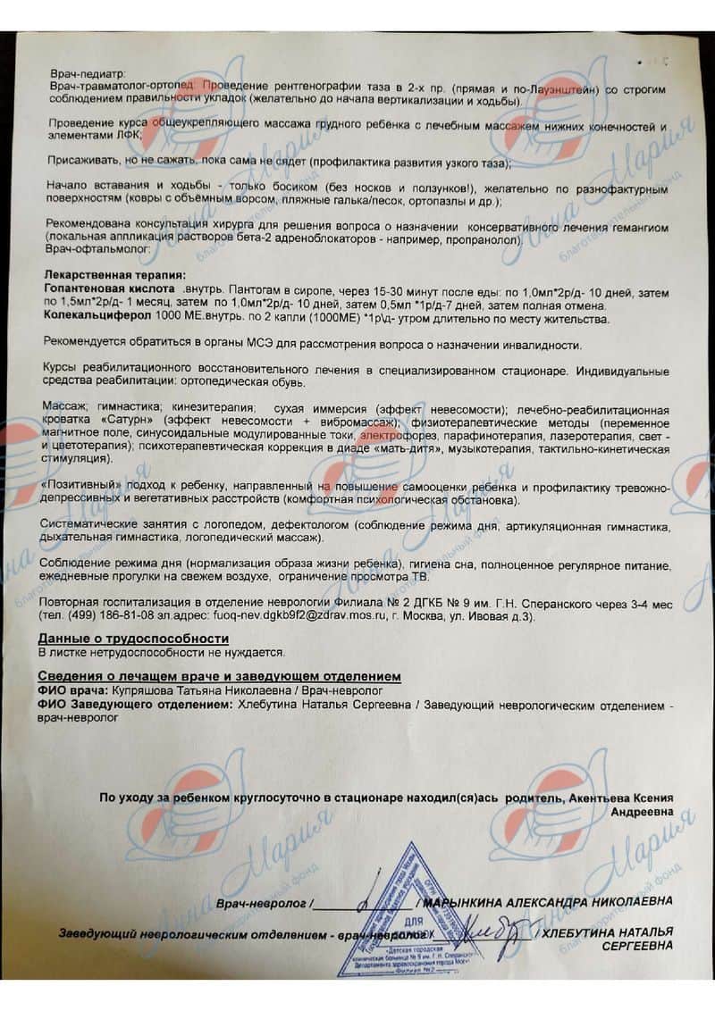 За это время было пройдено много процедур ЛФК, массаж, физиотерапия – платных и бесплатных. В областной больнице Полине подтвердили диагноз и выдали документы, на основании которых можно получить инвалидность. Девочка ездила в больницу им. Сперанского, чтобы пройти программу «Москва – столица здоровья».