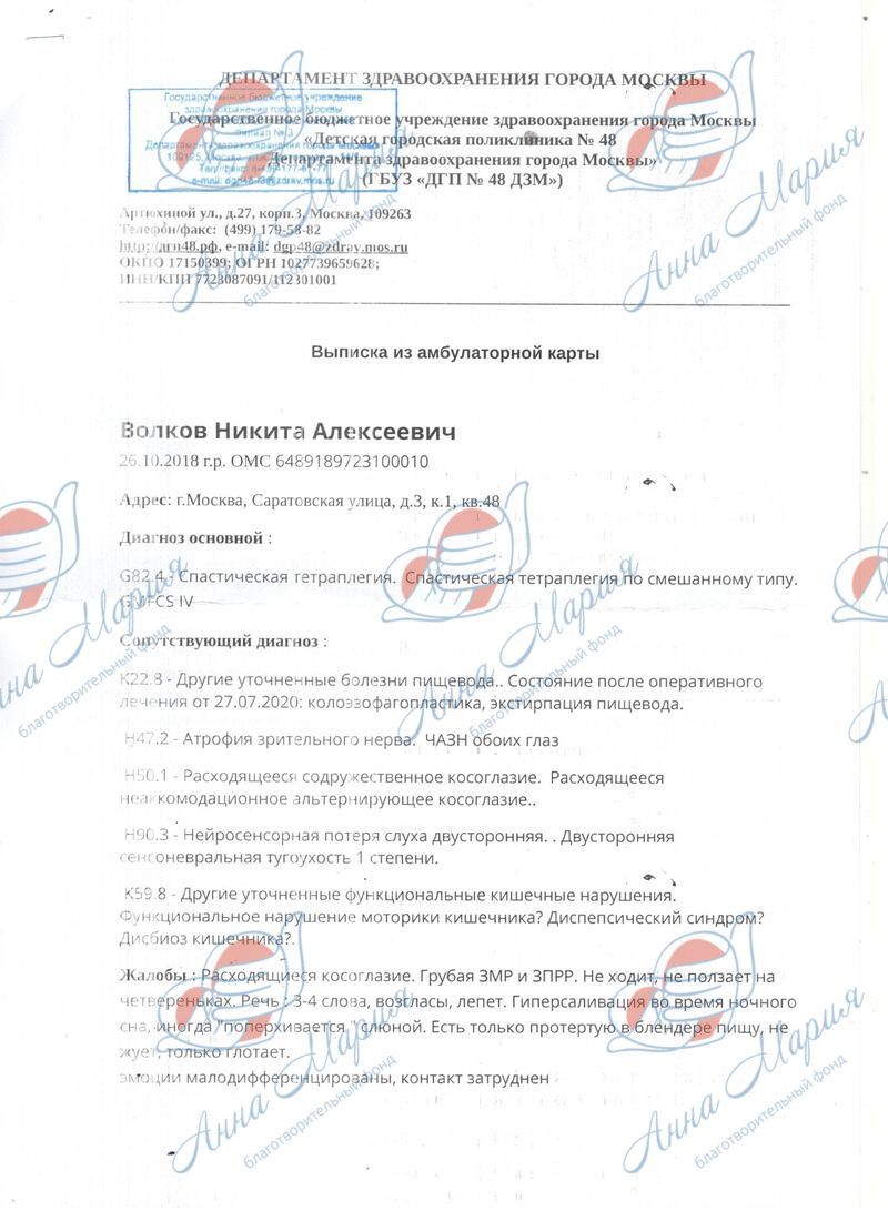Осложнения после операций дали о себе знать – у Никиты начались проблемы по неврологии, признаки гидроцефалии. Врачи сказали, что он всю жизнь будет «овощем». Мама решилась на переезд в Москву, где ему сняли гастростому. Но операция не прошла без последствий – начались судороги, диффузное поражение мозжечка и коры мозга.