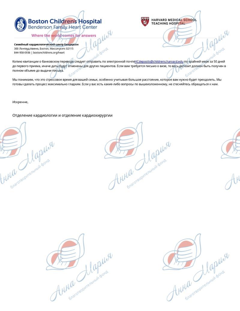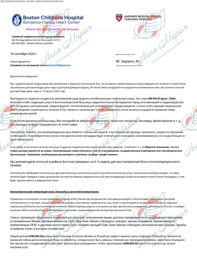Мама Яна направила результаты обследований во многие клиники Европы и Америки, чтобы узнать мнение разных хирургов. И только профессор Педро Дель Нидо из Boston Children's Hospital согласился провести операцию в США. По его мнению, Ян – кандидат на 1,5 желудочковую или 2-х желудочковую коррекцию. Клиника выставила счет на лечение, оплатить которой самостоятельно семья не в состоянии.